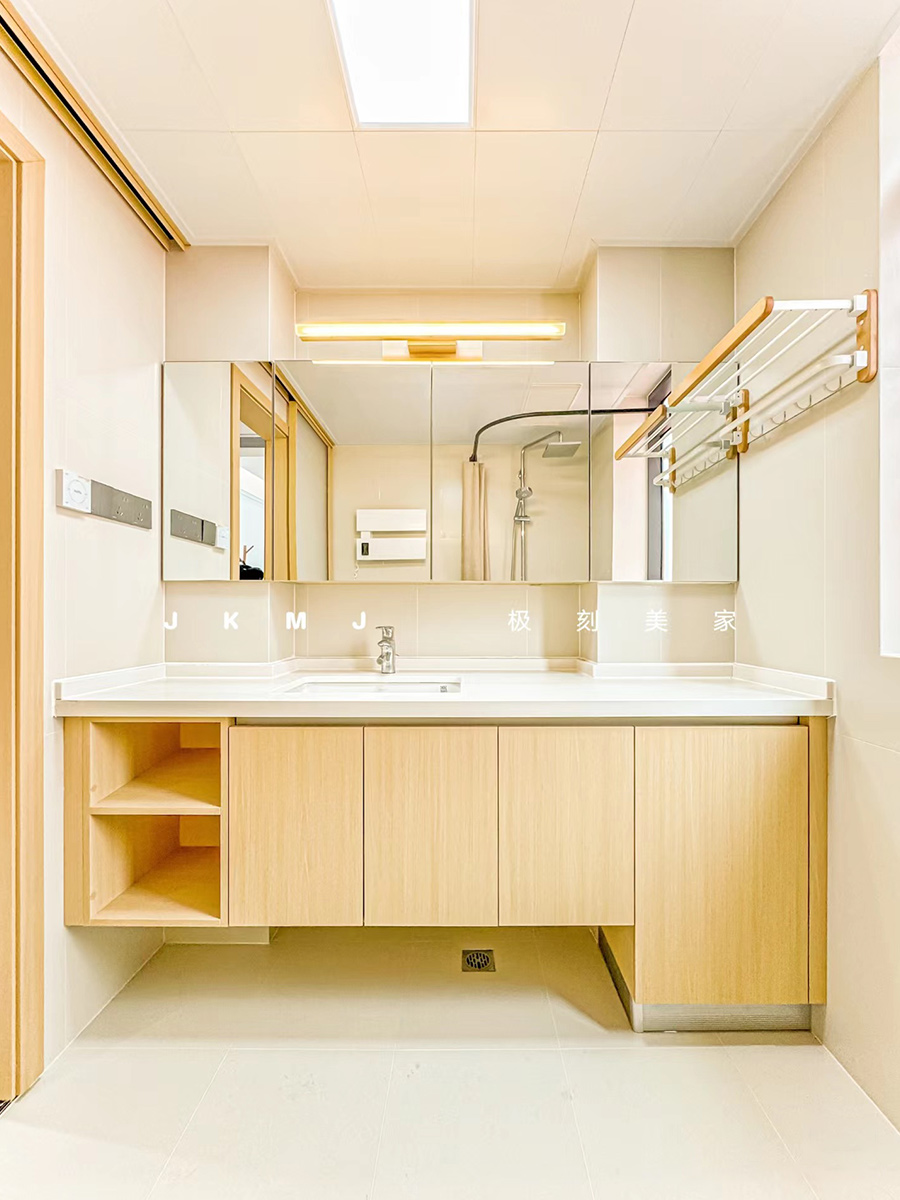 地上通铺原木色地板,干净自然。进门做下沉式玄关,落尘区和公区分界明显。