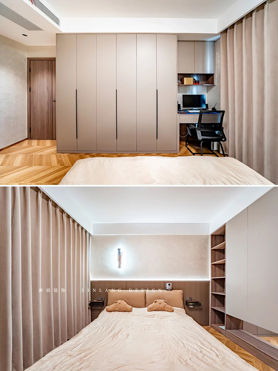 ▪主卧大套间,整面墙做收纳衣柜,结合半墙造型隔断,让空间不显单一。
