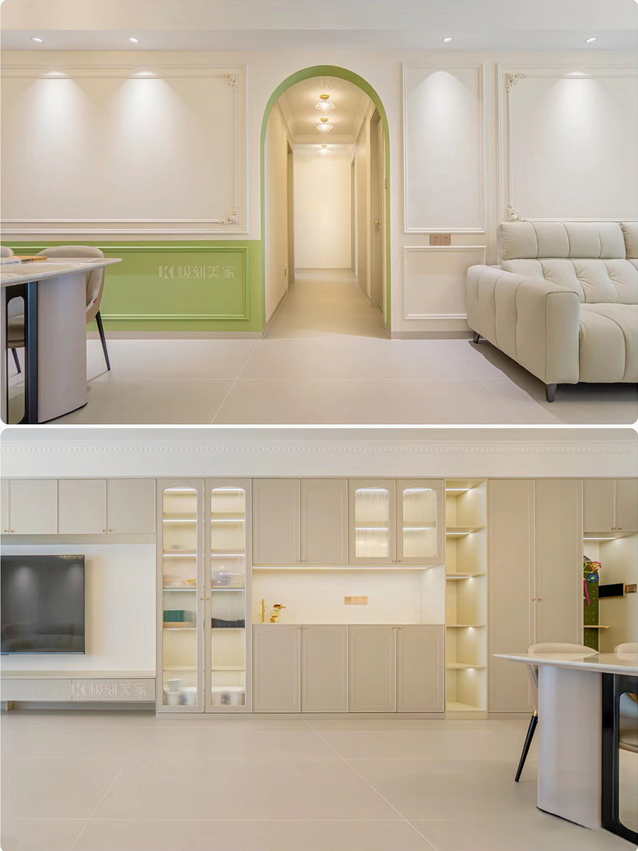 整体法式奶油为主,奶油白和牛油果绿的搭配,整体温馨又充满活力