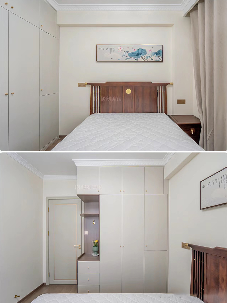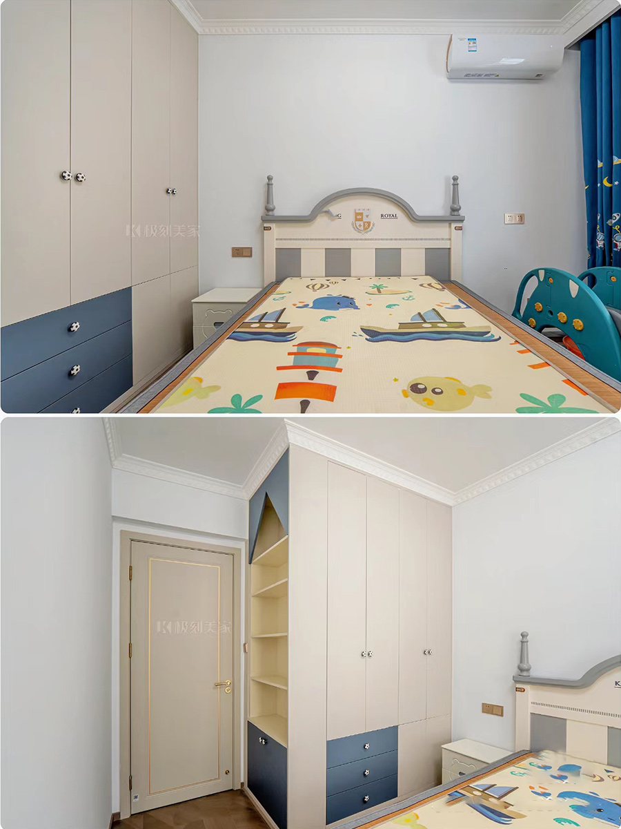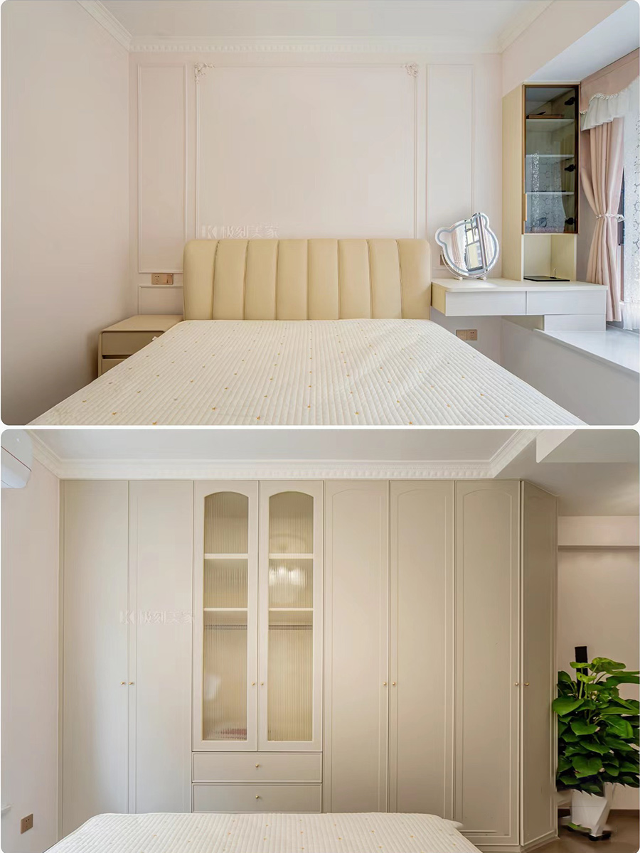 卧室延续法式PU线条与角花,斜角柜的设计,更添氛围感