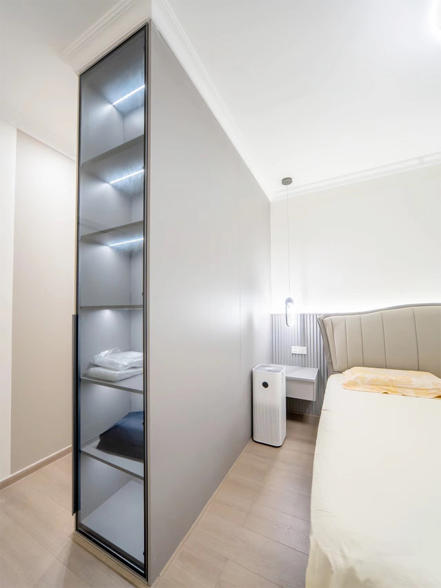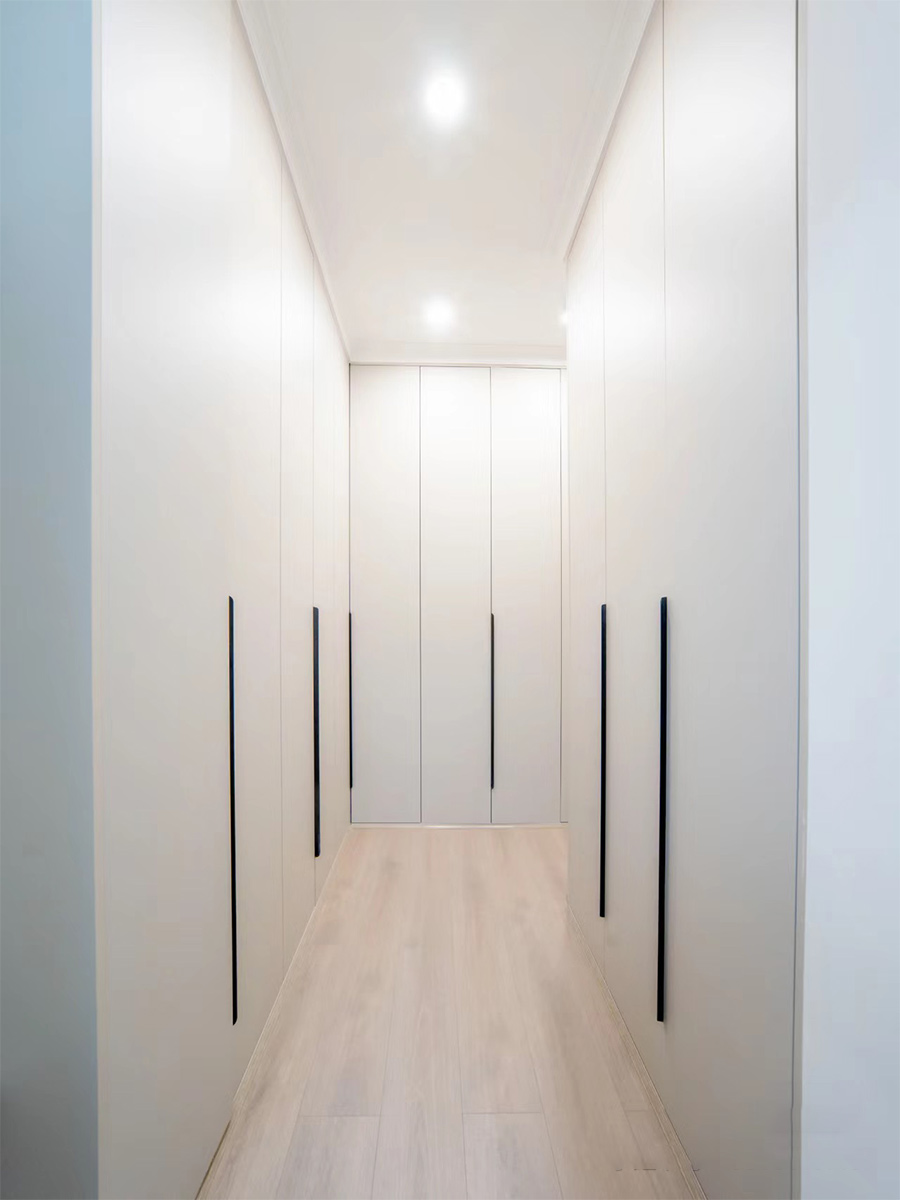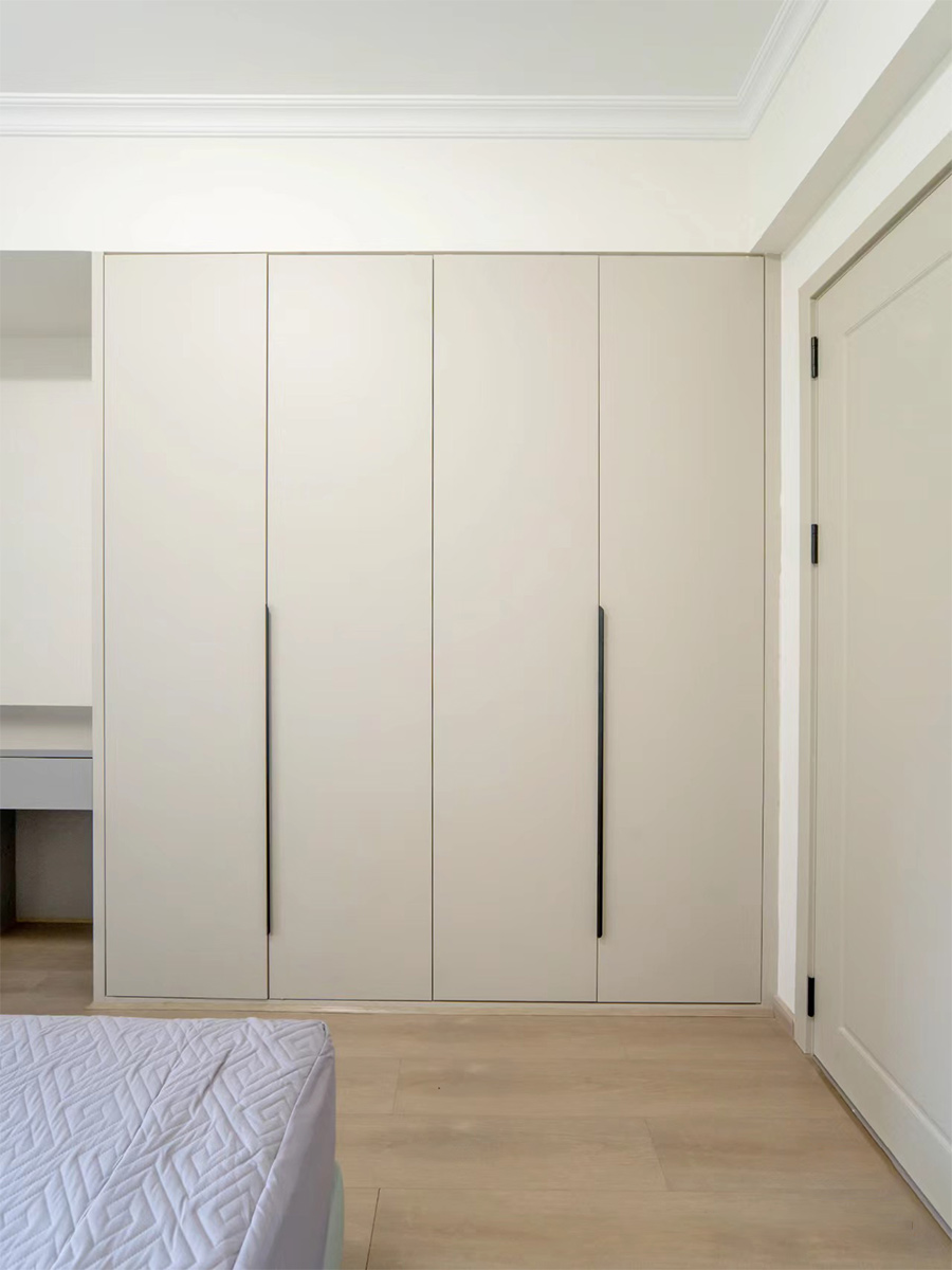 柜体采用18厚杉木芯板,柜门采用欧松板PET肤感柜门,一门到顶,五金使用原装进口的百隆五金