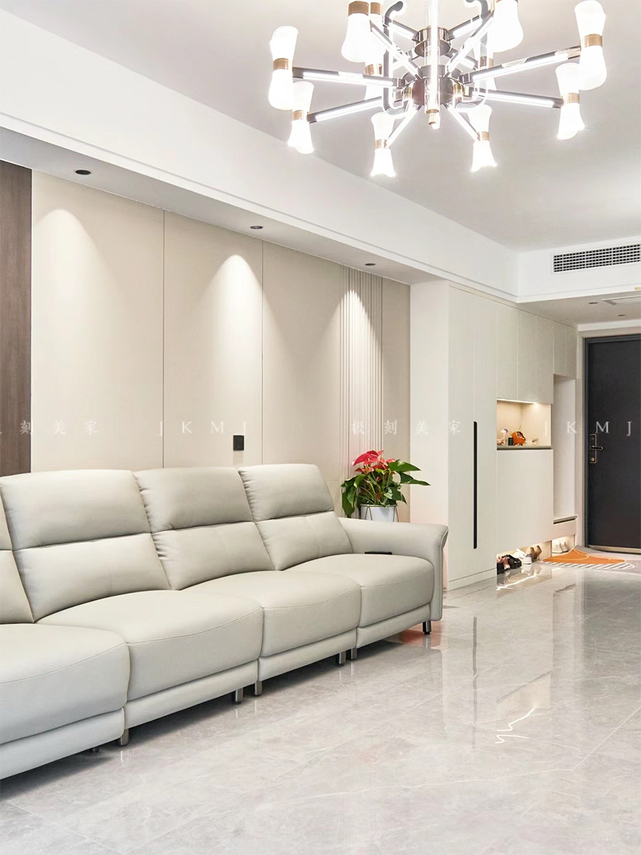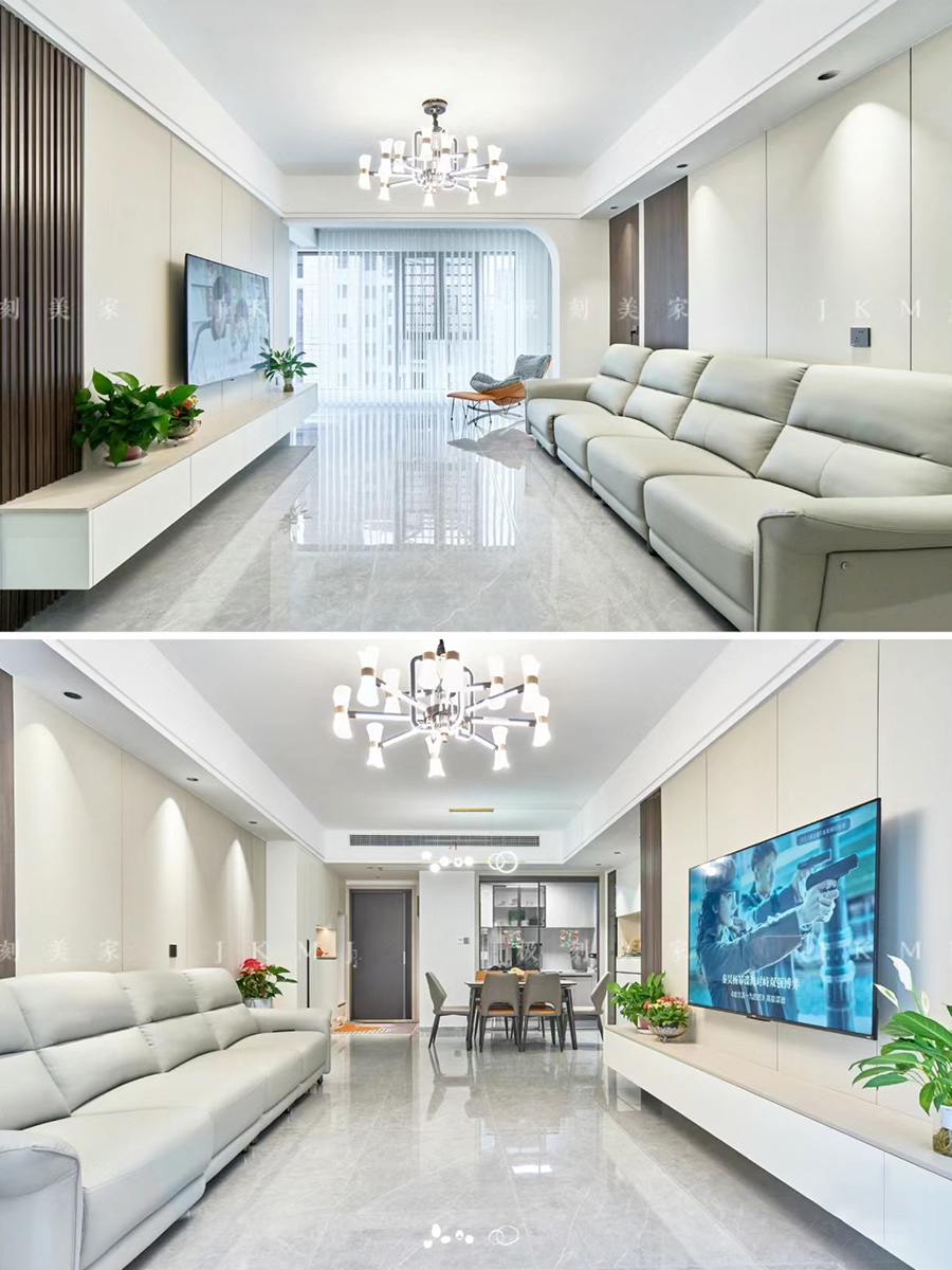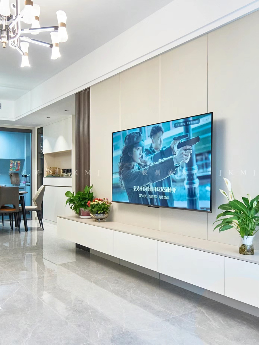 一字型悬浮电视柜和沙发背景墙搭配,简单又高级