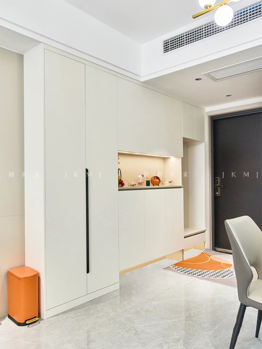 入户柜做挂衣区、开放格和换鞋凳设计,充分利用空间