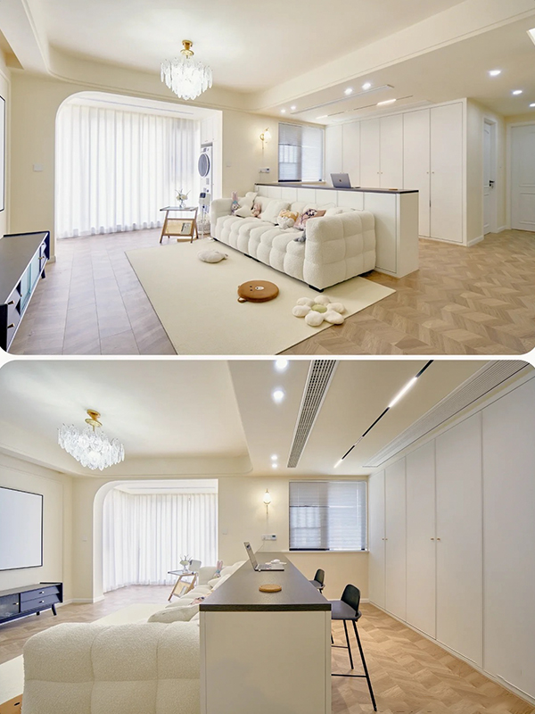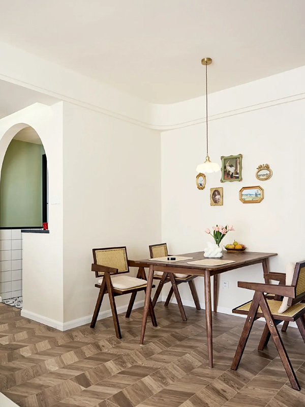 石膏线条铺开,奶油色的墙面搭配人字拼地板,优雅气场渗透进整个空间,素净的白色与牛油果绿在空间交汇,营造出优雅的轻法式氛围.