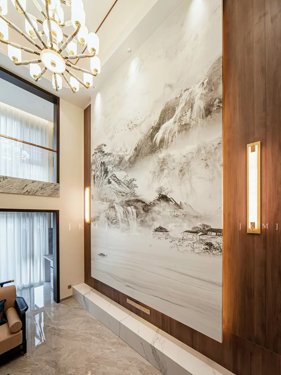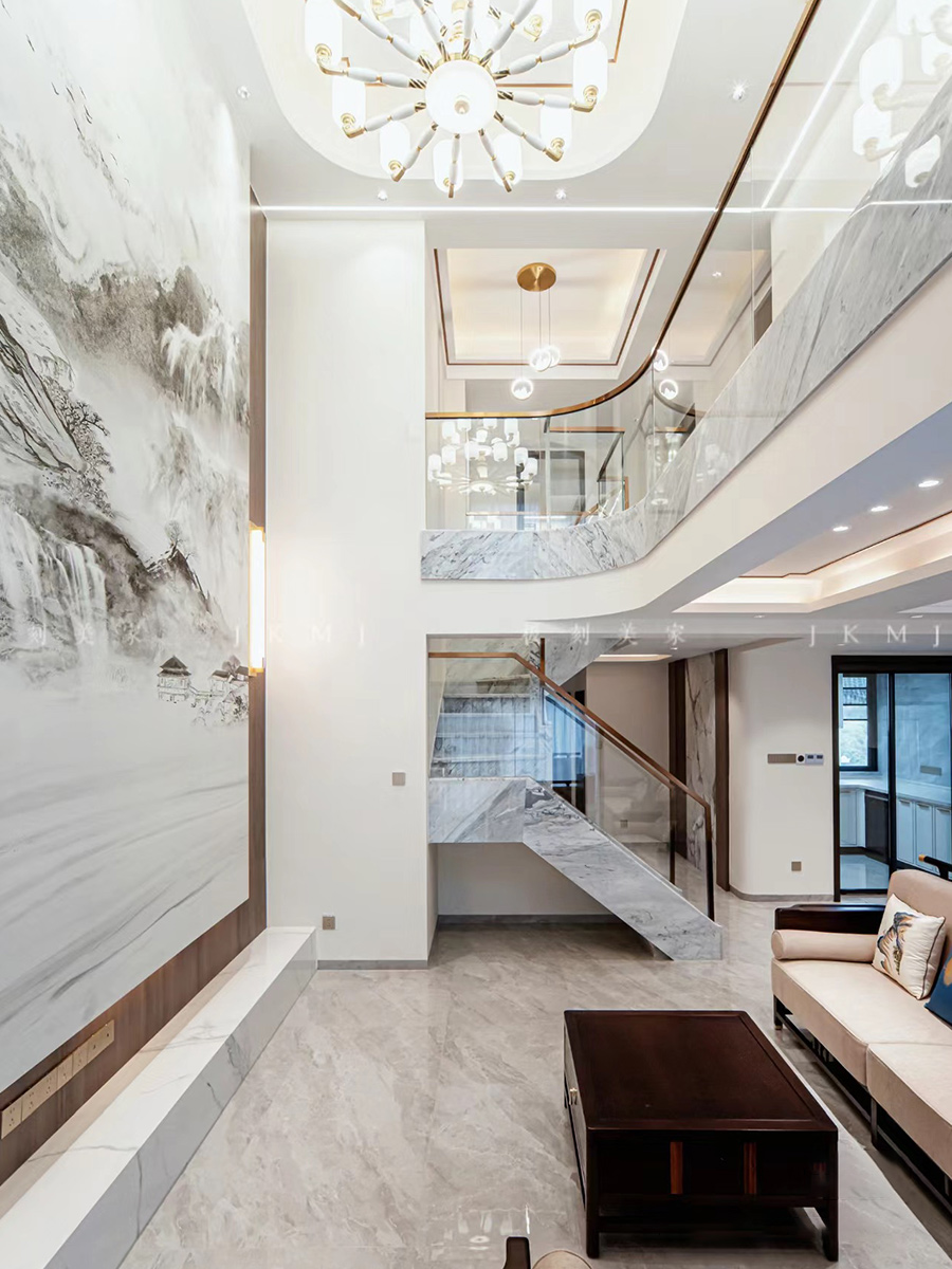 ▪️挑空的客厅江两层的建筑空间打通,以中式葵纹为灵感、以国画山水大理石做背景