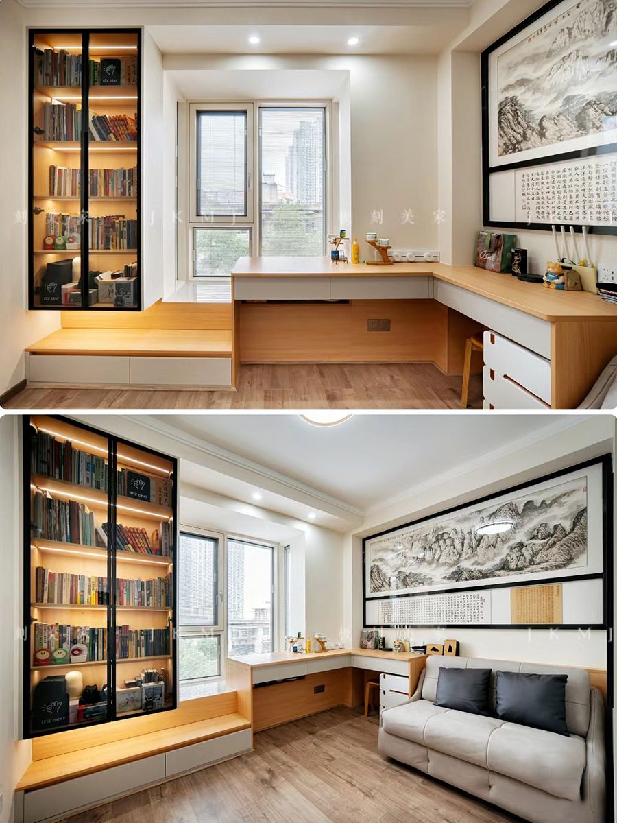 书房运用玻璃柜门的设计,美观的同时实用感也很绝