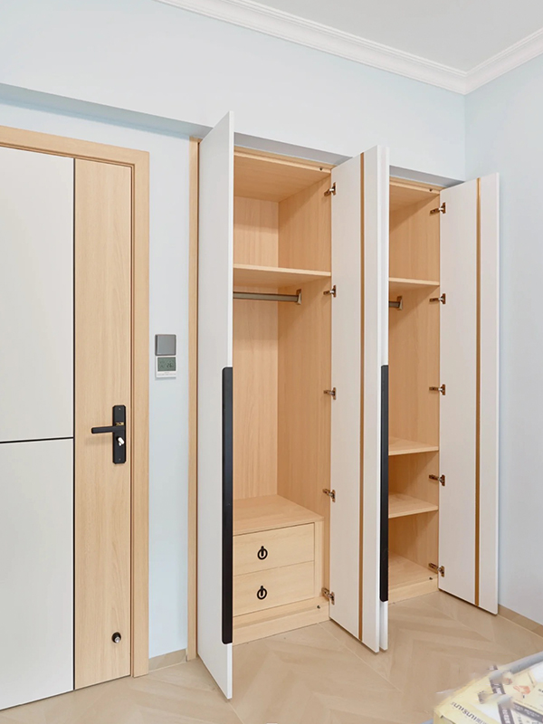 衣柜采用中间挂立式设计,可以更方便的拿取衣服,也增加了更多放衣服的空间,衣柜根据房间大小设计,一柜到顶,上方不留空间,不易留灰,方便清扫,非常方便。