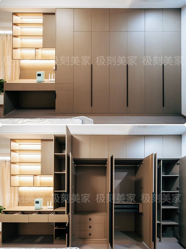 全屋高端定制:柜体板材18厚杉木实芯板,柜门有pet肤感、高光、超晶、五金使用原装进口奥地利百隆五金