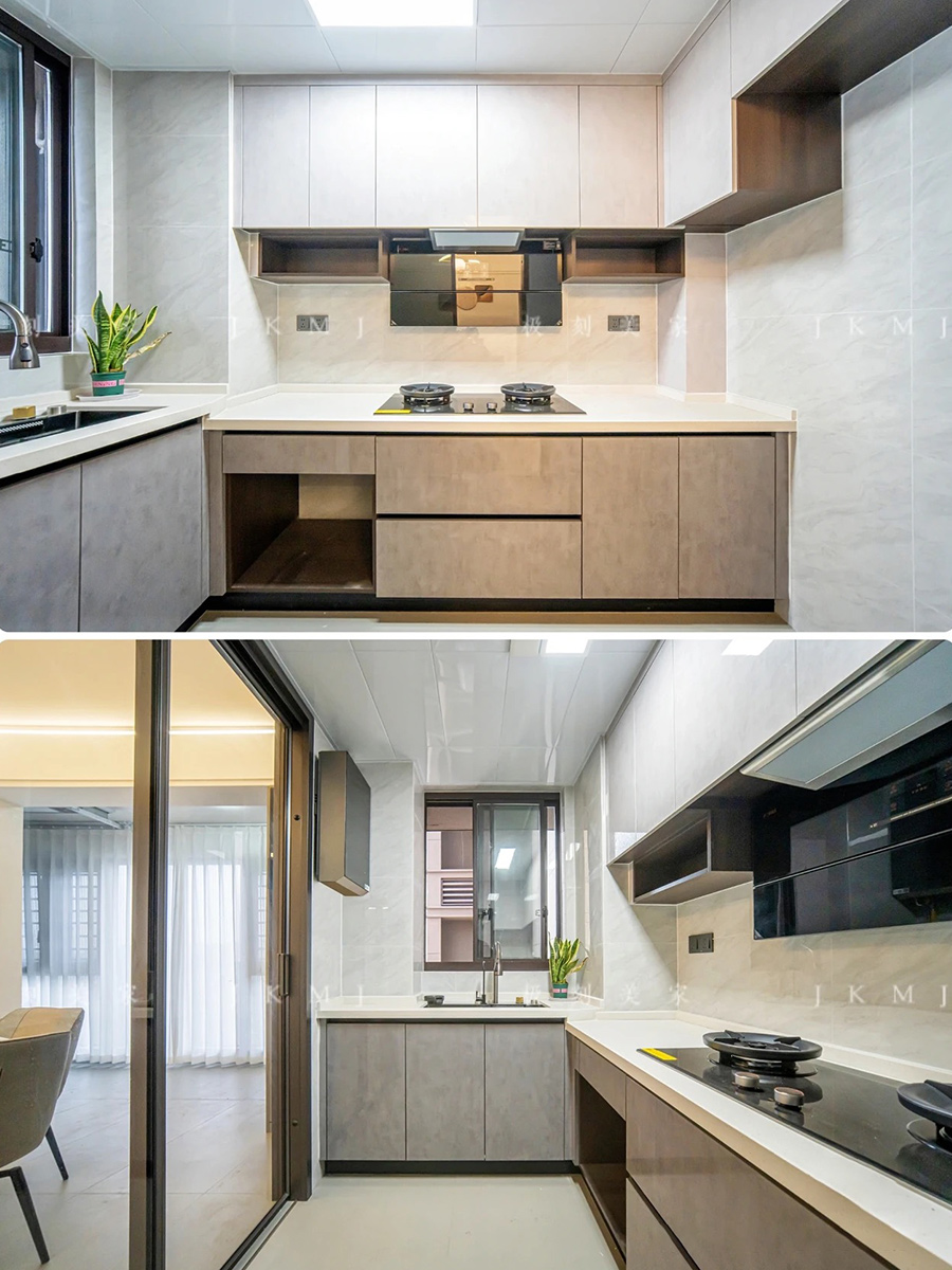 厨房采用L型布局,高低台面、洗切炒一体设计,操作更便捷