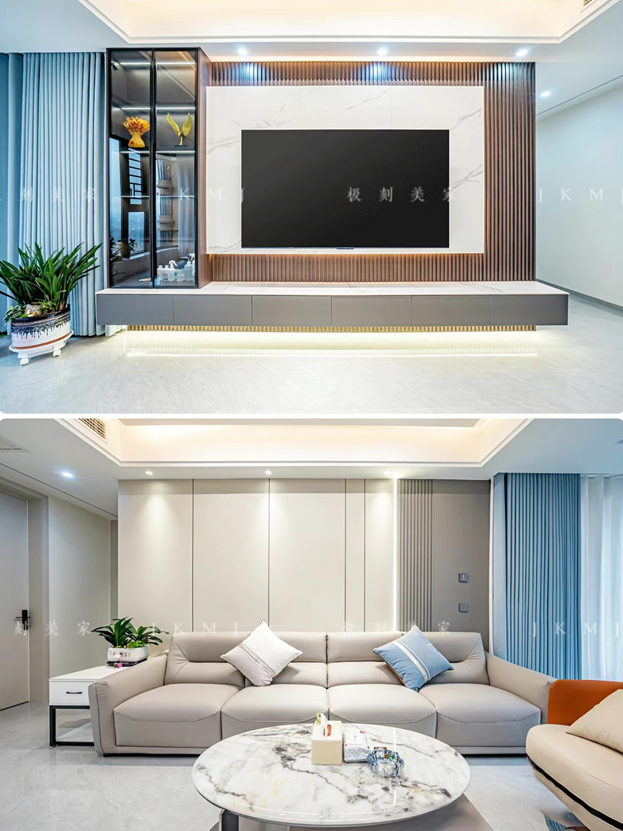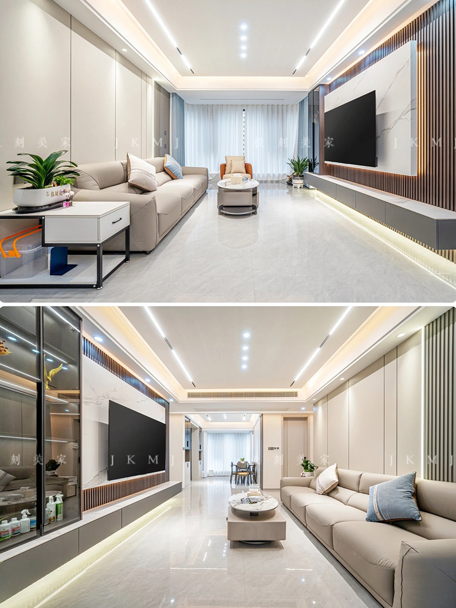 悬浮电视背景墙搭配L型收纳柜,颜值与收纳并存