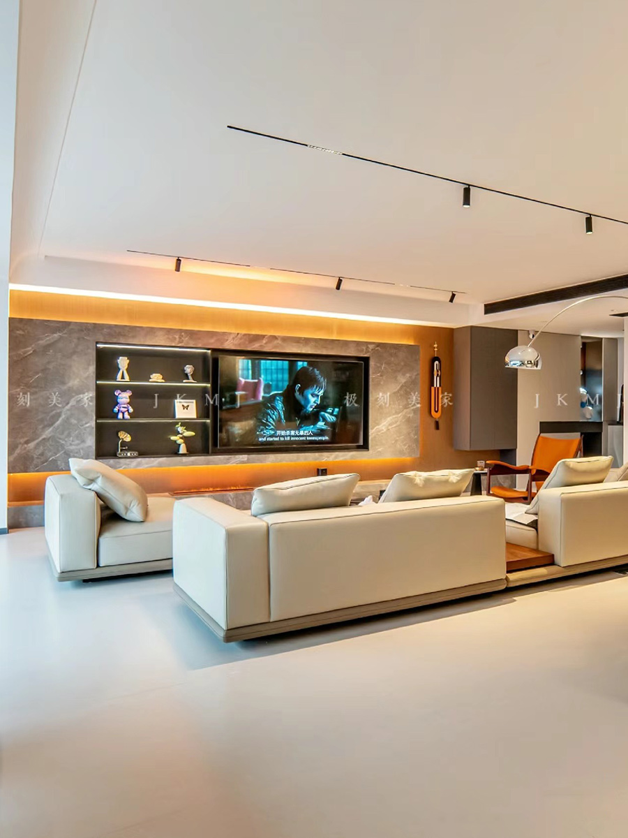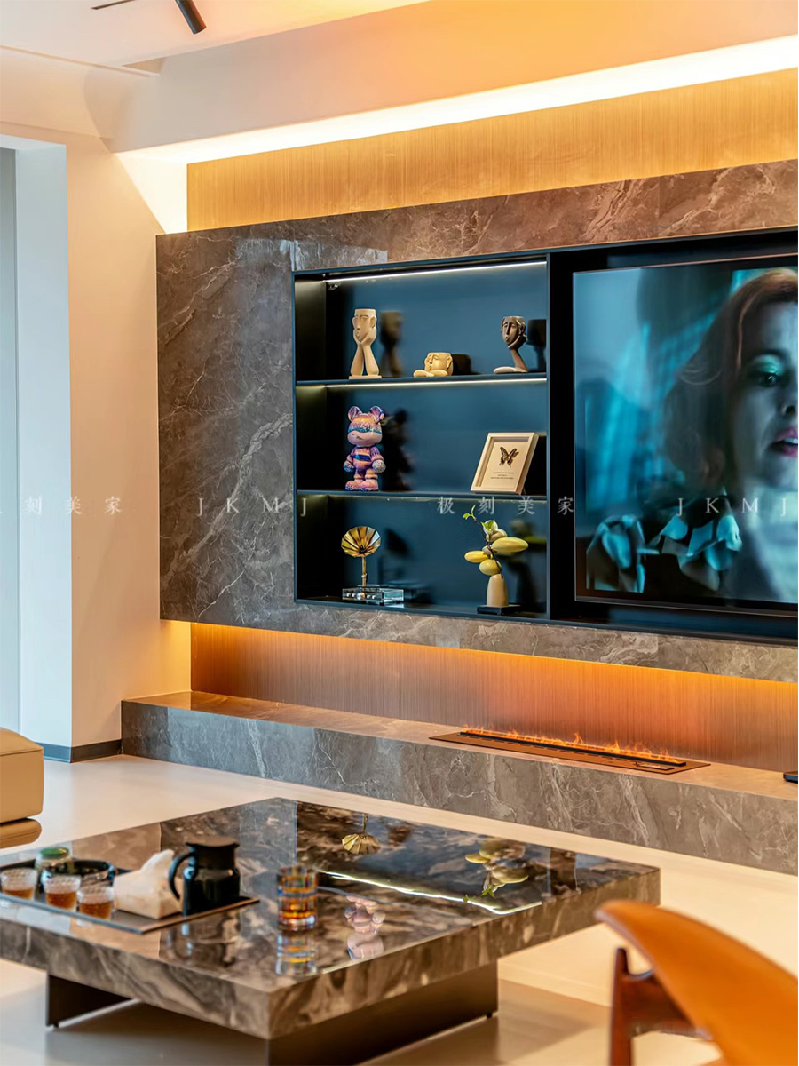 电视背景墙采用岩板做悬浮设计,搭配灯带,整体氛围感十足