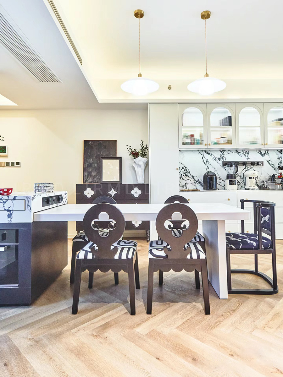 瀚江府160平法式复古精装全改+整家定制只需61800元即可搞定。天使白实木柜体搭配珍珠白的造型门,让全屋的颜值更上一层。