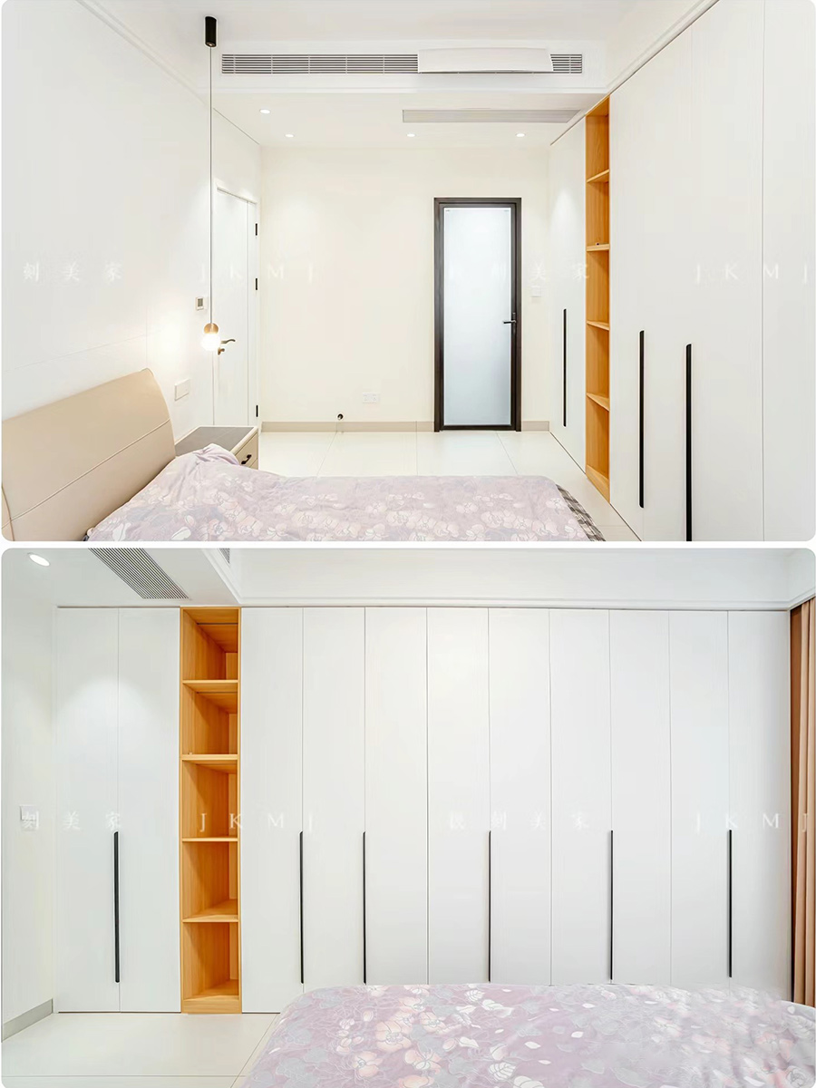 全屋高端定制:柜体万象18厚杉木实芯板,柜门新西兰进口欧松板,有pet肤感、高光、超晶,五金使用原装进口奥地利百隆一字底铰链