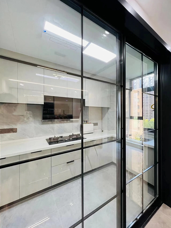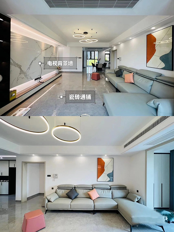 客厅、餐厅、厨房、阳台都是用大块浅灰色亮面砖通铺,无波导线,用灰色美缝,几乎看不到缝隙,地面整个贯穿,视觉上更亮堂显大