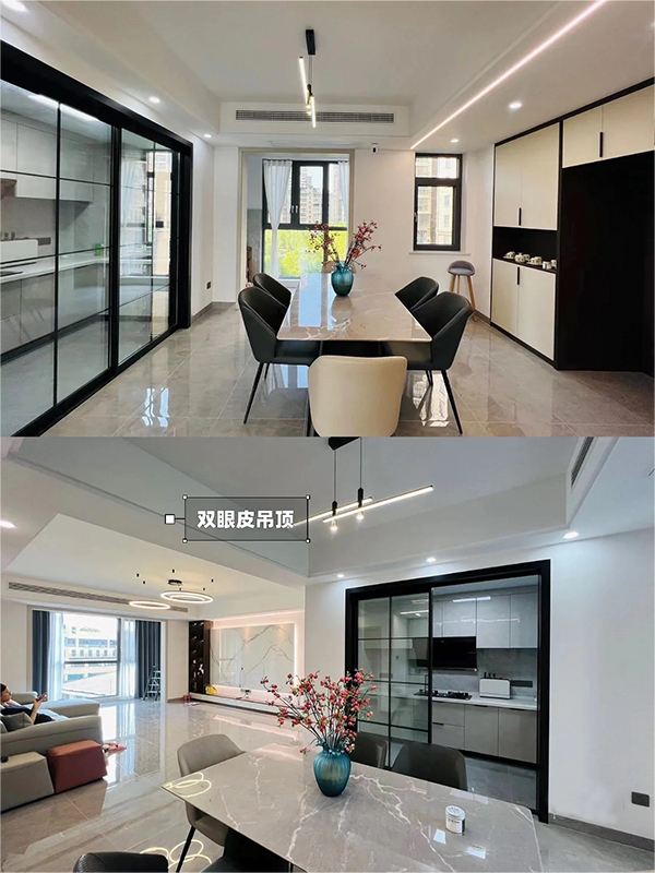 简单的双眼皮吊顶不压层高,还不会积灰,能增加空间的层次感。还起到了装饰作用,简洁大气耐看