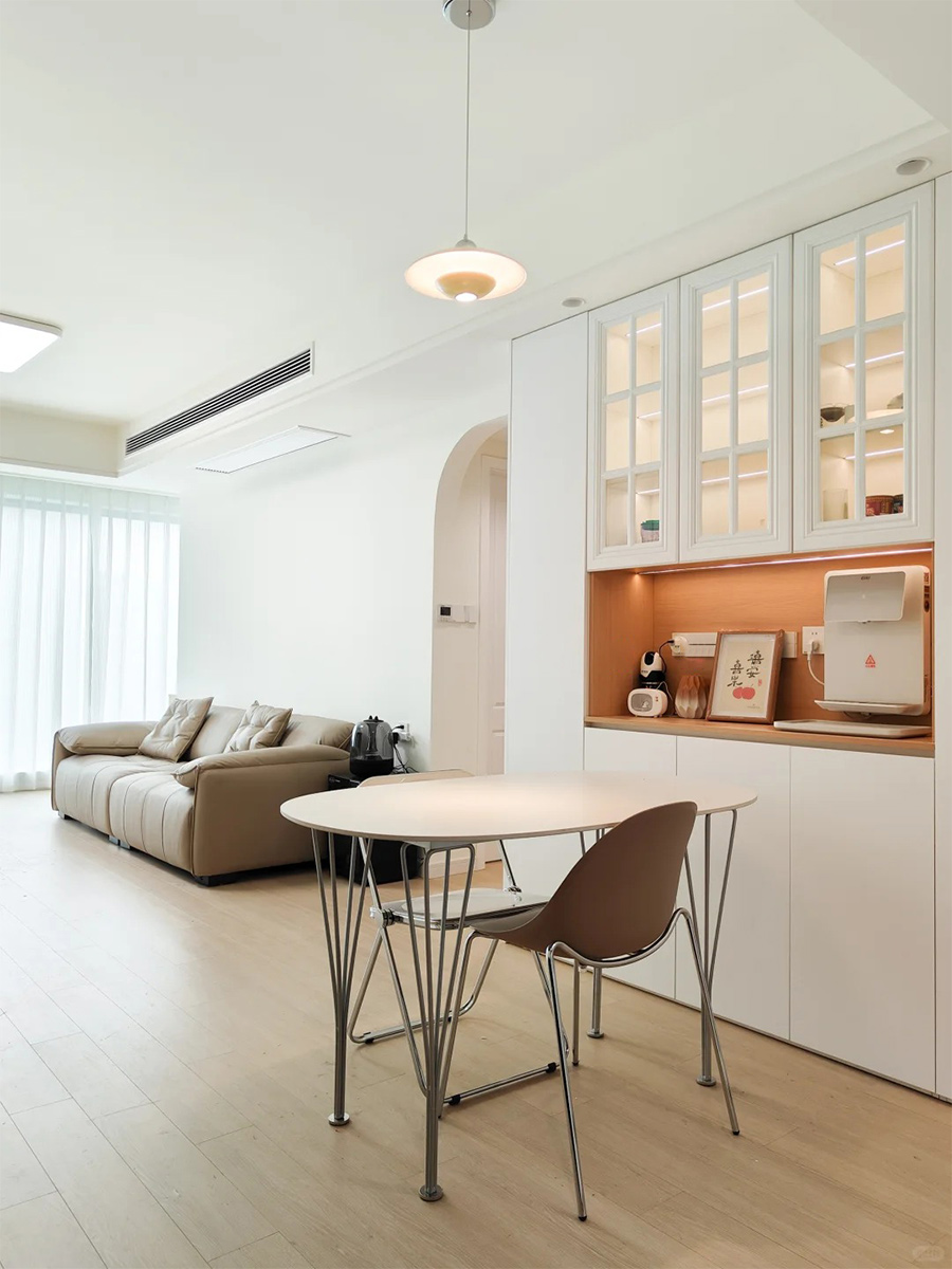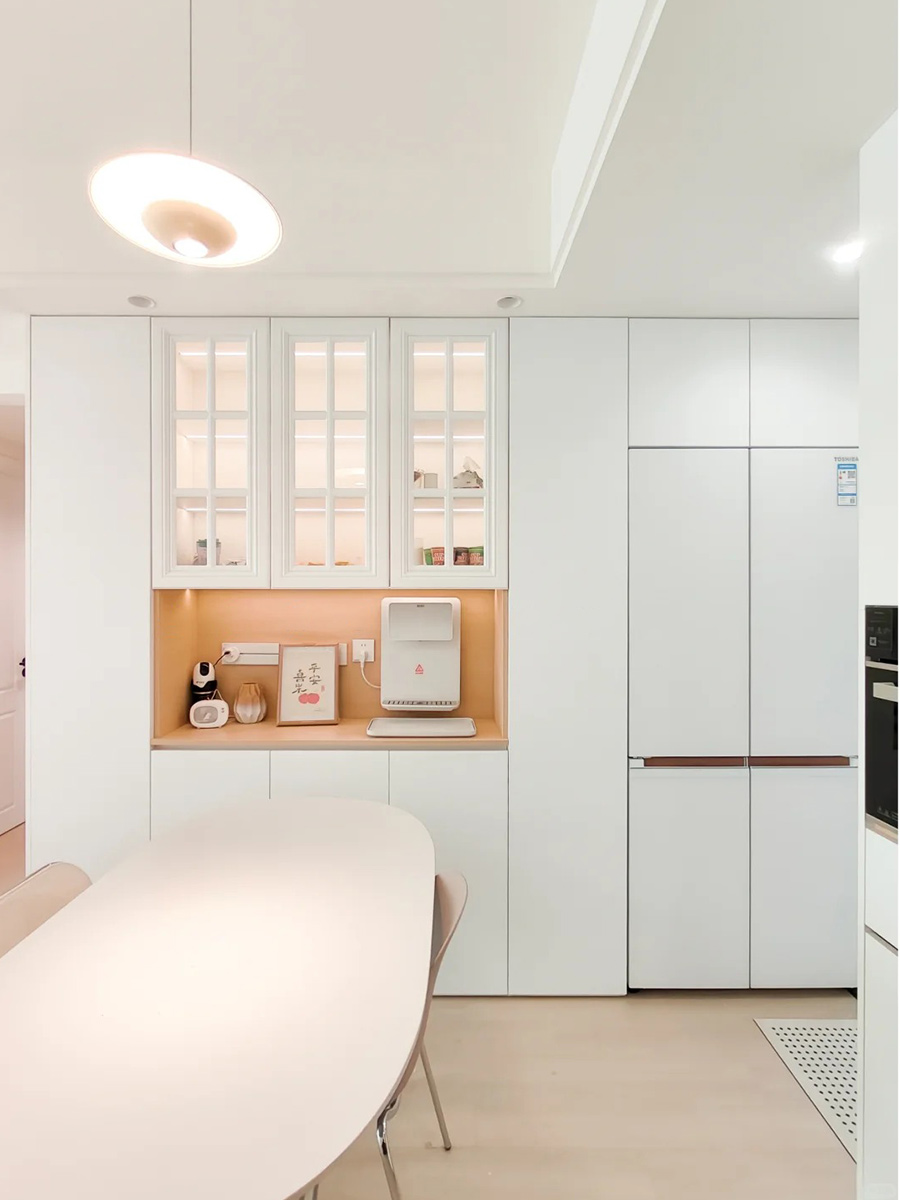 冰箱嵌入严丝合缝,藏露有致的三分段餐边柜成为点睛亮点。