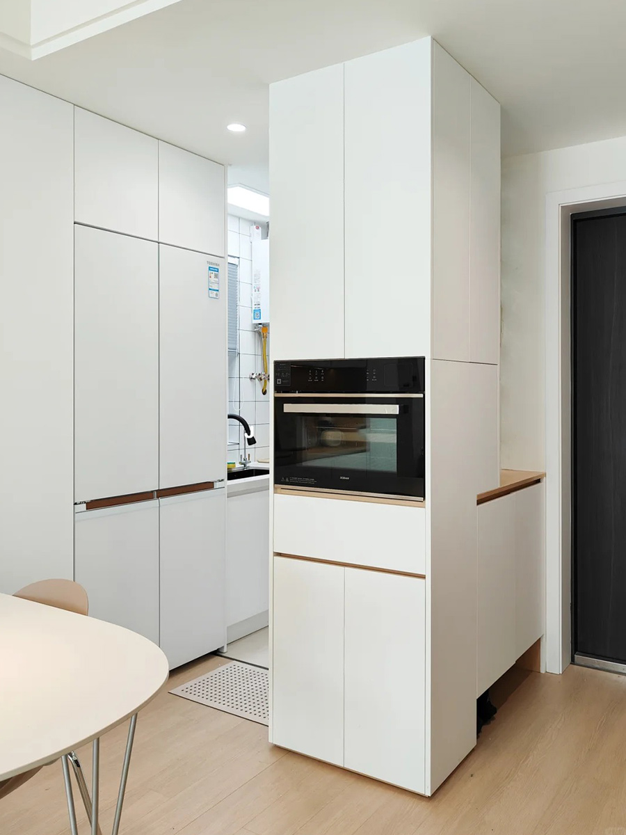 入户鞋柜和餐边柜结合,侧旁做嵌入式蒸烤箱,空间利用率高。