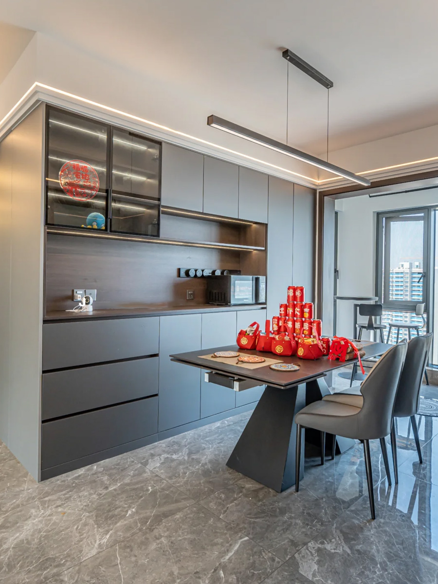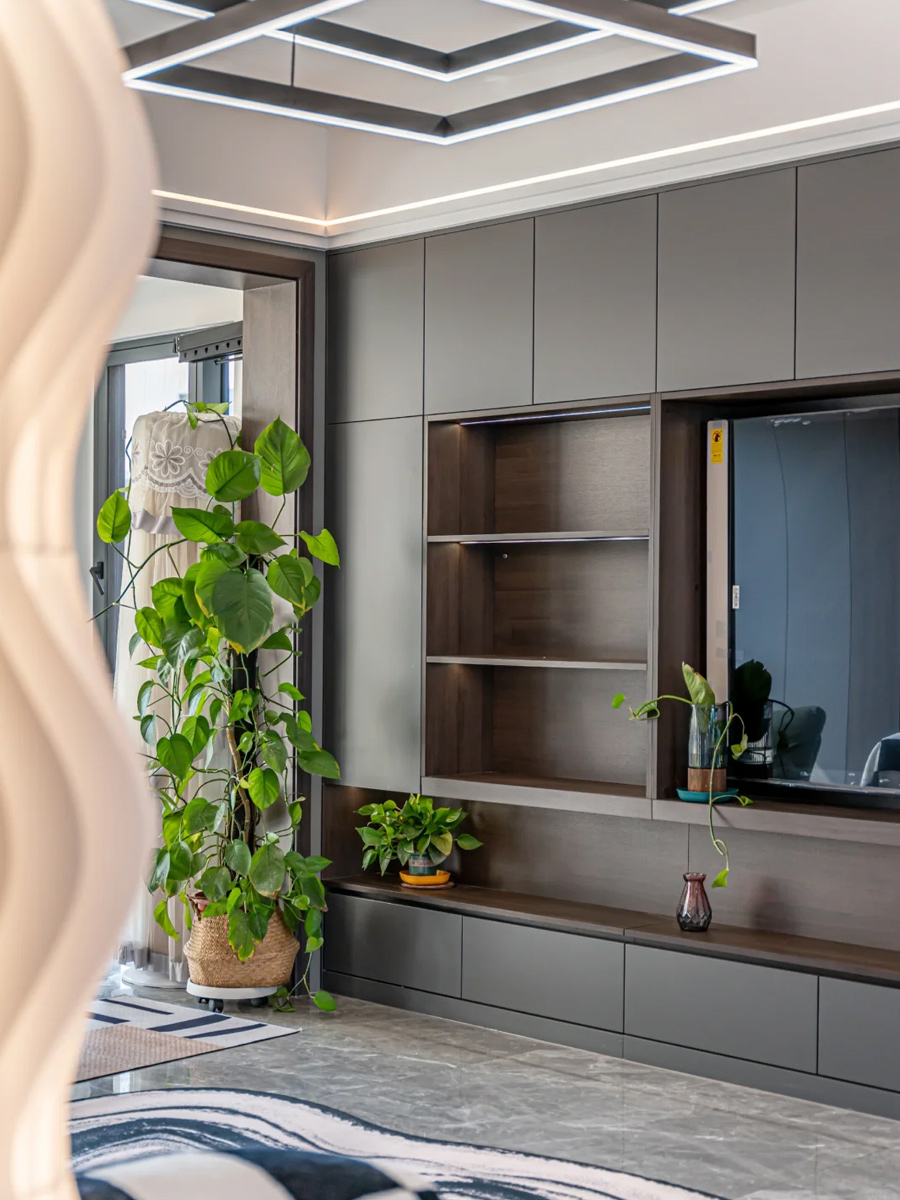 追求质感的同时,实用方面也做。满墙电视柜,餐边柜、衣柜+梳妆台一体等等,再多东西也不怕乱