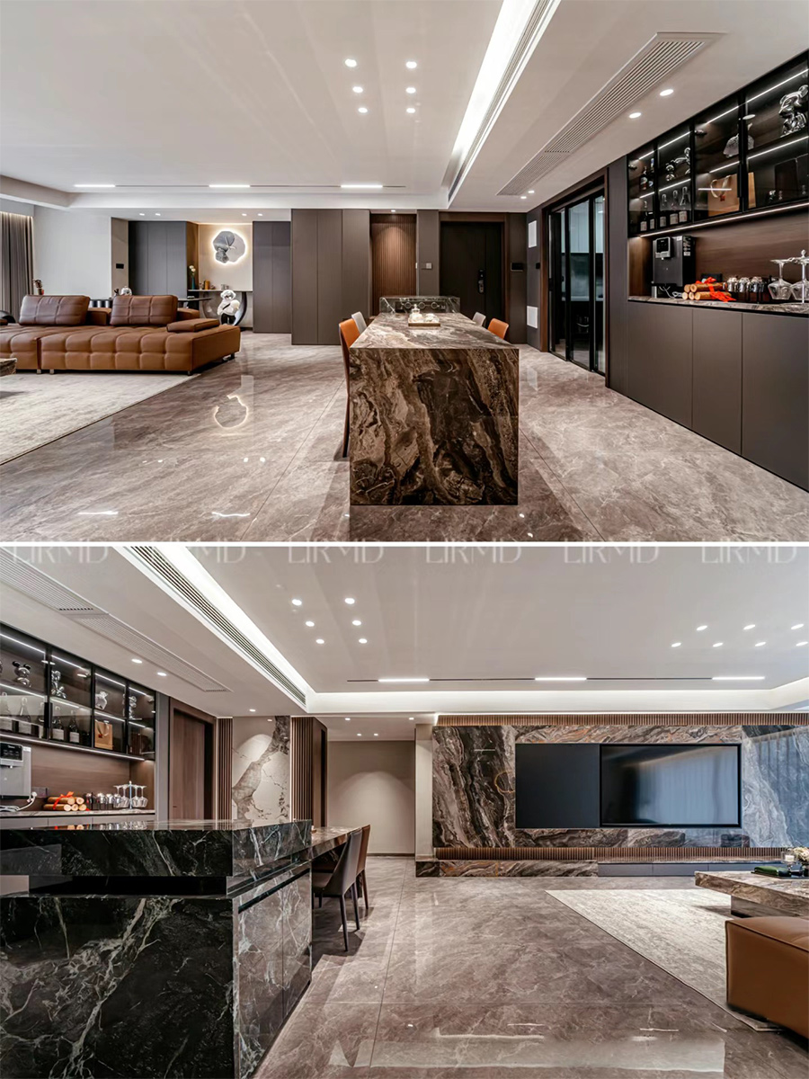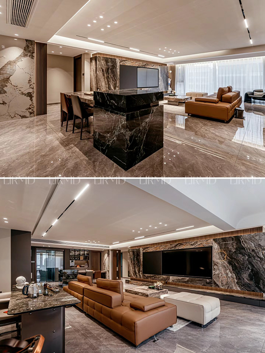轻于形 奢于质 意式轻奢 整体色调高级深灰色调搭配,用岩板打破整体空间深沉感,让空间层次和效果体现更高级感。