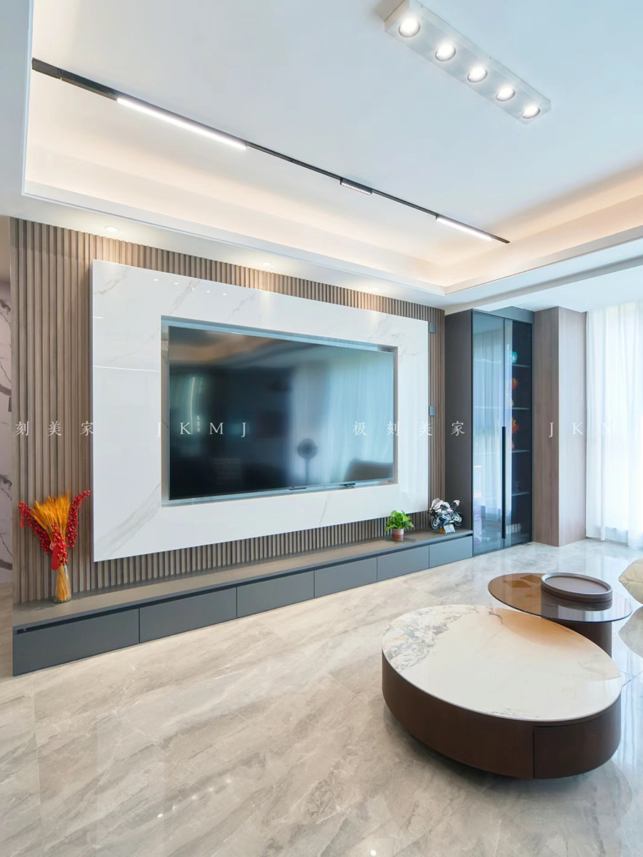 电视背景墙运用岩板+木栅板设计,更有层次感