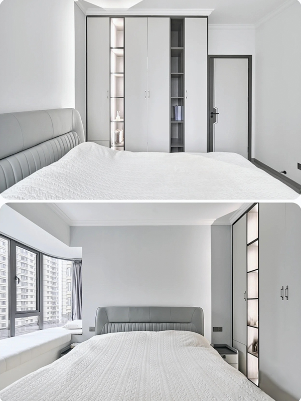 全房共定制了12个柜子,柜体采用足18厚杉木芯板,柜门采用LSB板PET肤感柜门,一门到顶,五金使用原装进口的百隆五金