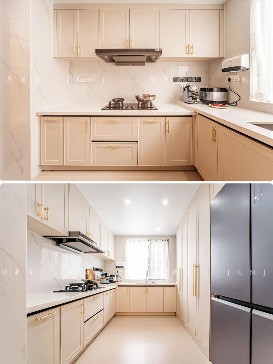 全屋同款同色同造型,打造门墙柜一体化设计,搭配金色手柄,更加精致