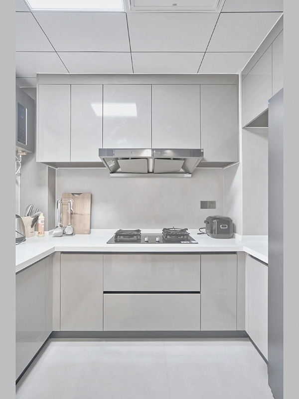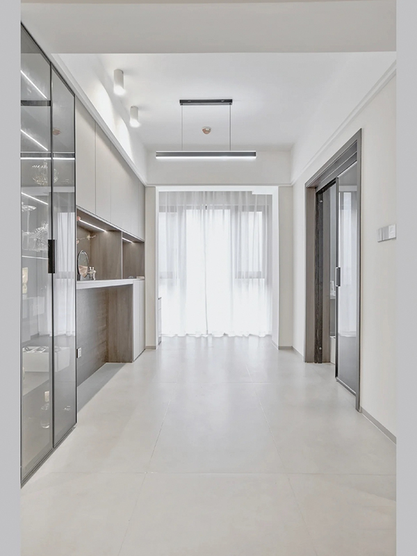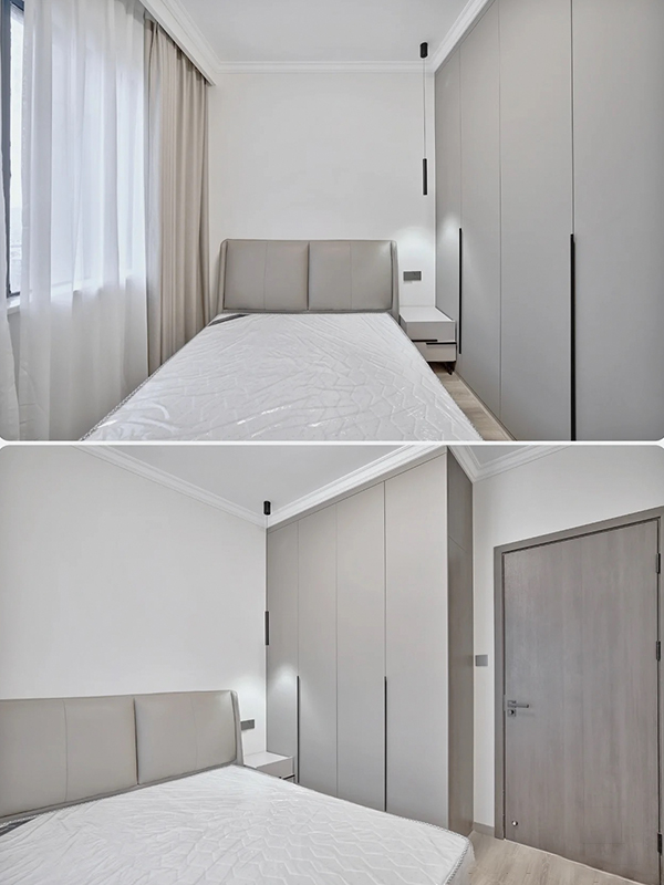 全房共定制了6个柜子,柜体采用足18厚杉木芯板,柜门采用LSB板PET肤感柜门,一门到顶,五金使用原装进口的百隆五金