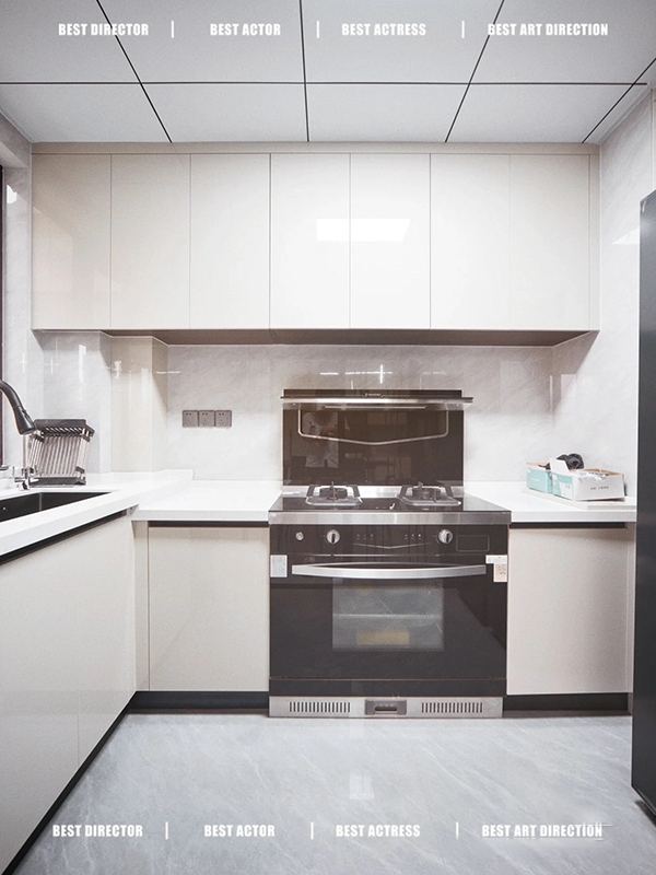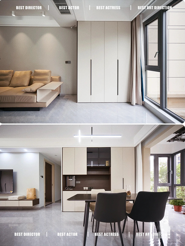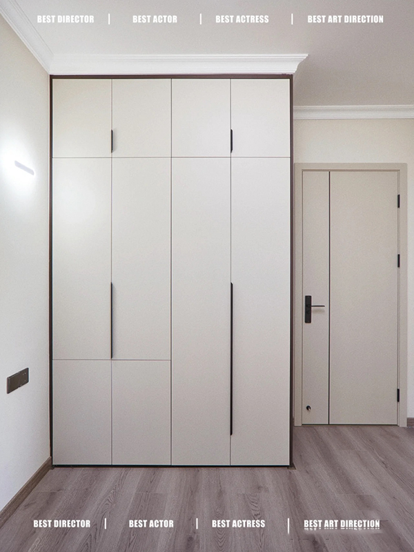 全房共定制了10个柜子,柜体采用足18厚杉木芯板,柜门采用LSB板PET肤感柜门,一门到顶,五金使用原装进口的百隆五金