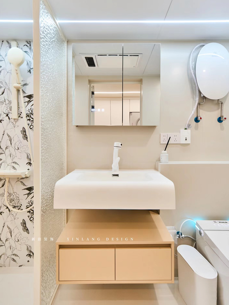 干湿区做屏风隔断,超薄热水器,1-2人居住完全够用。