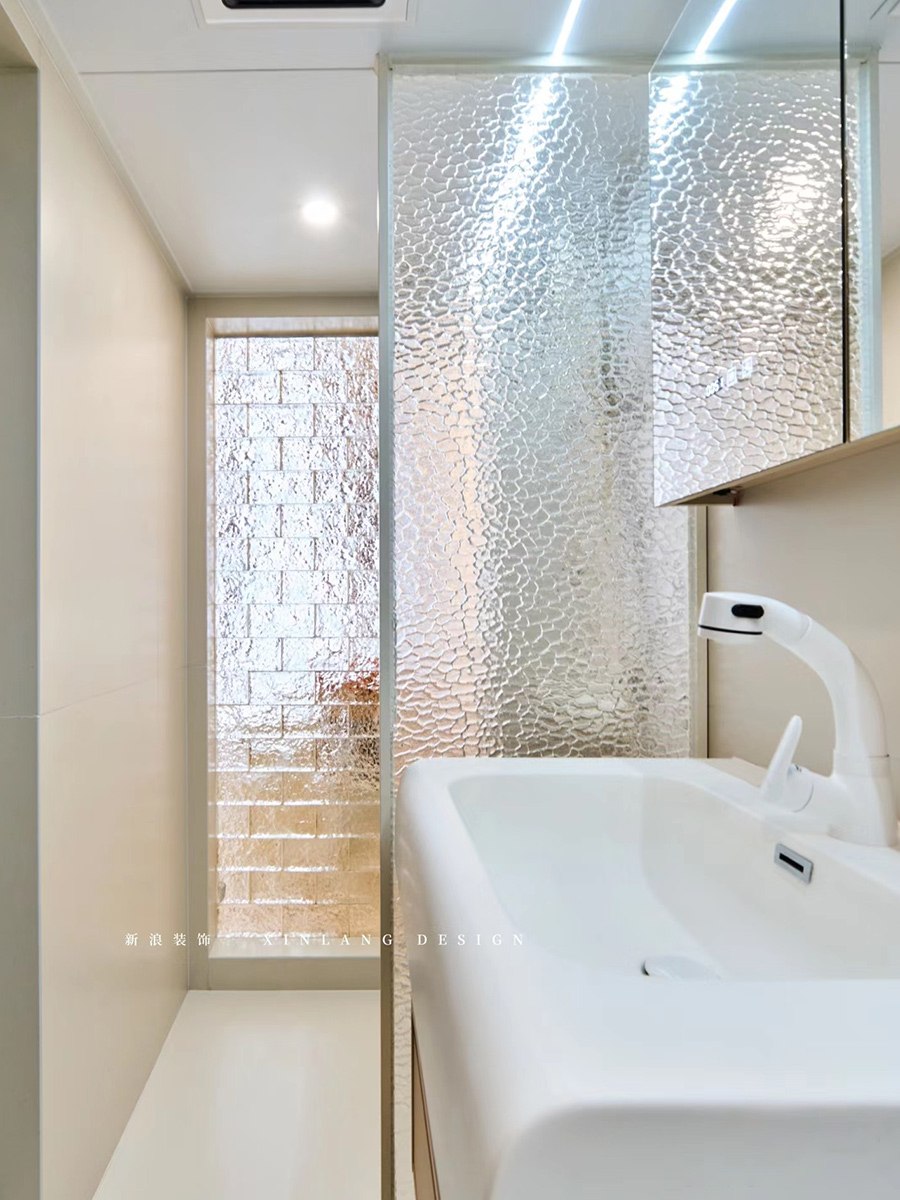 公寓的洗手间大多都是暗卫。利用玻璃砖墙,引入客厅光线,明亮升级。