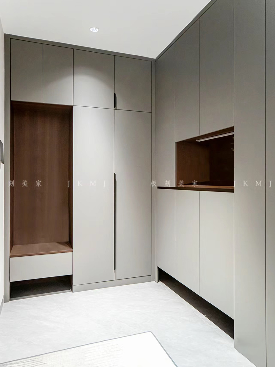 L型转角鞋柜,转角位置与沙发背景墙做一体设计,搭配隐形门,空间整体性更强