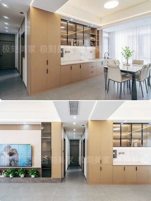 全屋高端定制:柜体板材18厚杉木实芯板,柜门有pet肤感、高光、超晶、五金使用原装进口奥地利百隆五金
