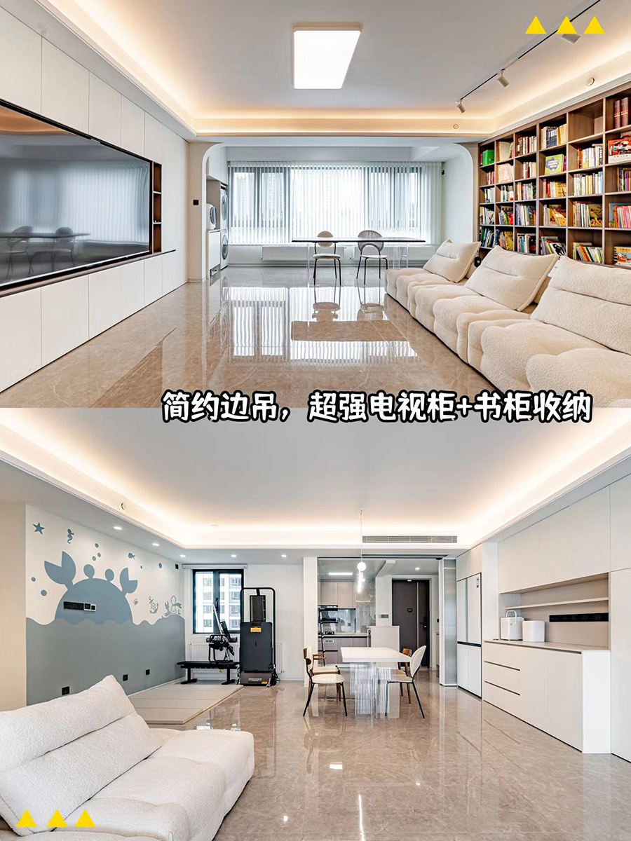 入户鞋柜连接餐边柜、电视背景等,动线流畅,视野开阔。