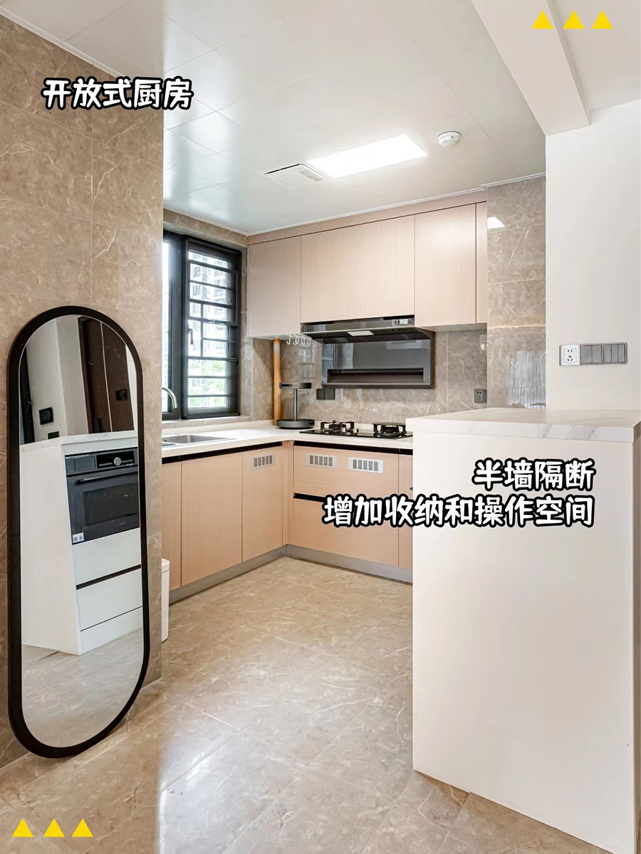 厨房做半开放式,半墙隔断嵌入蒸烤机,上方做操作台面扩充。巨型四联动推拉门,进一步扩大空间。