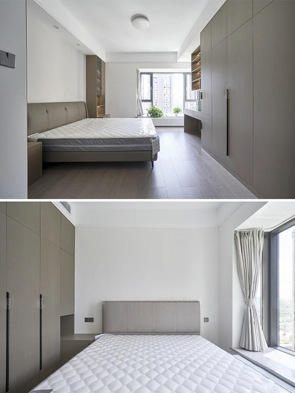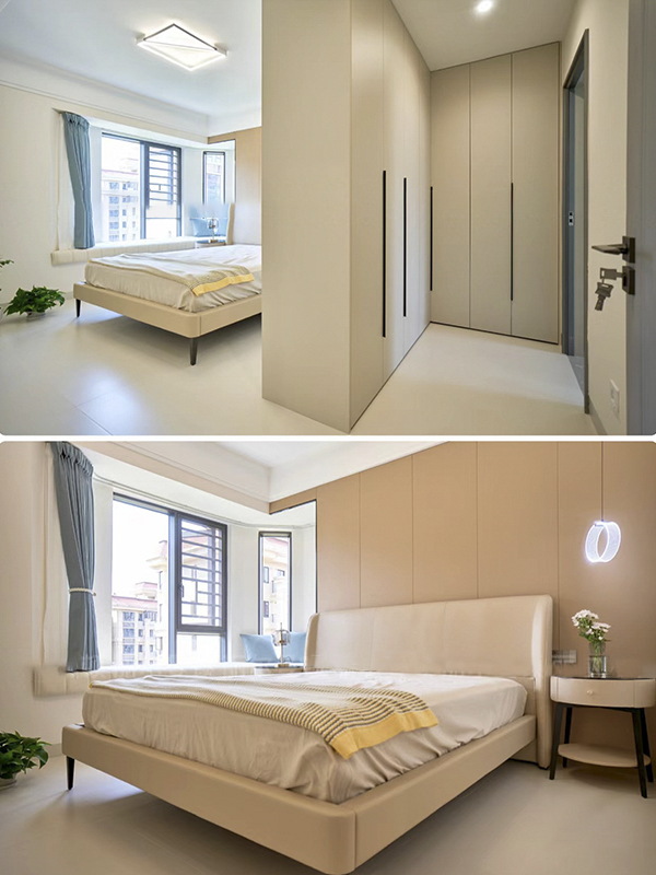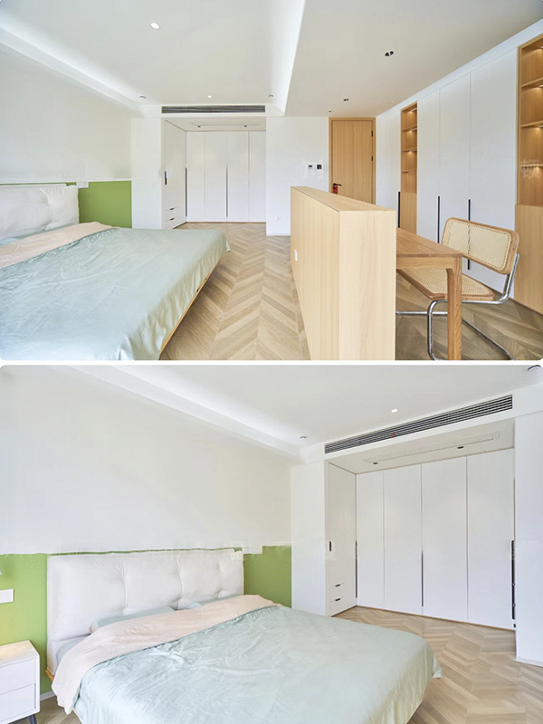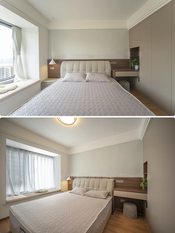卧室小的话建议将衣柜➕床头柜一体式设计,不会挡柜门。