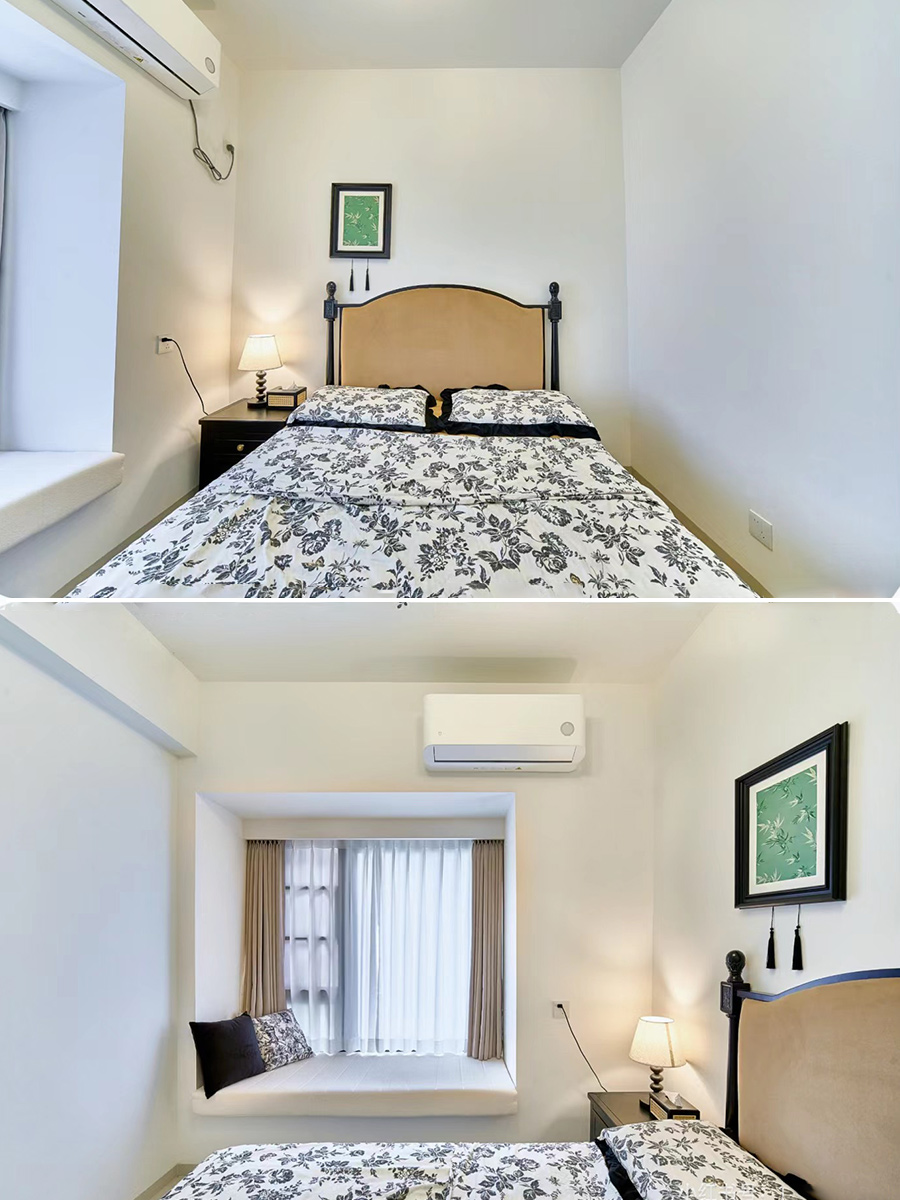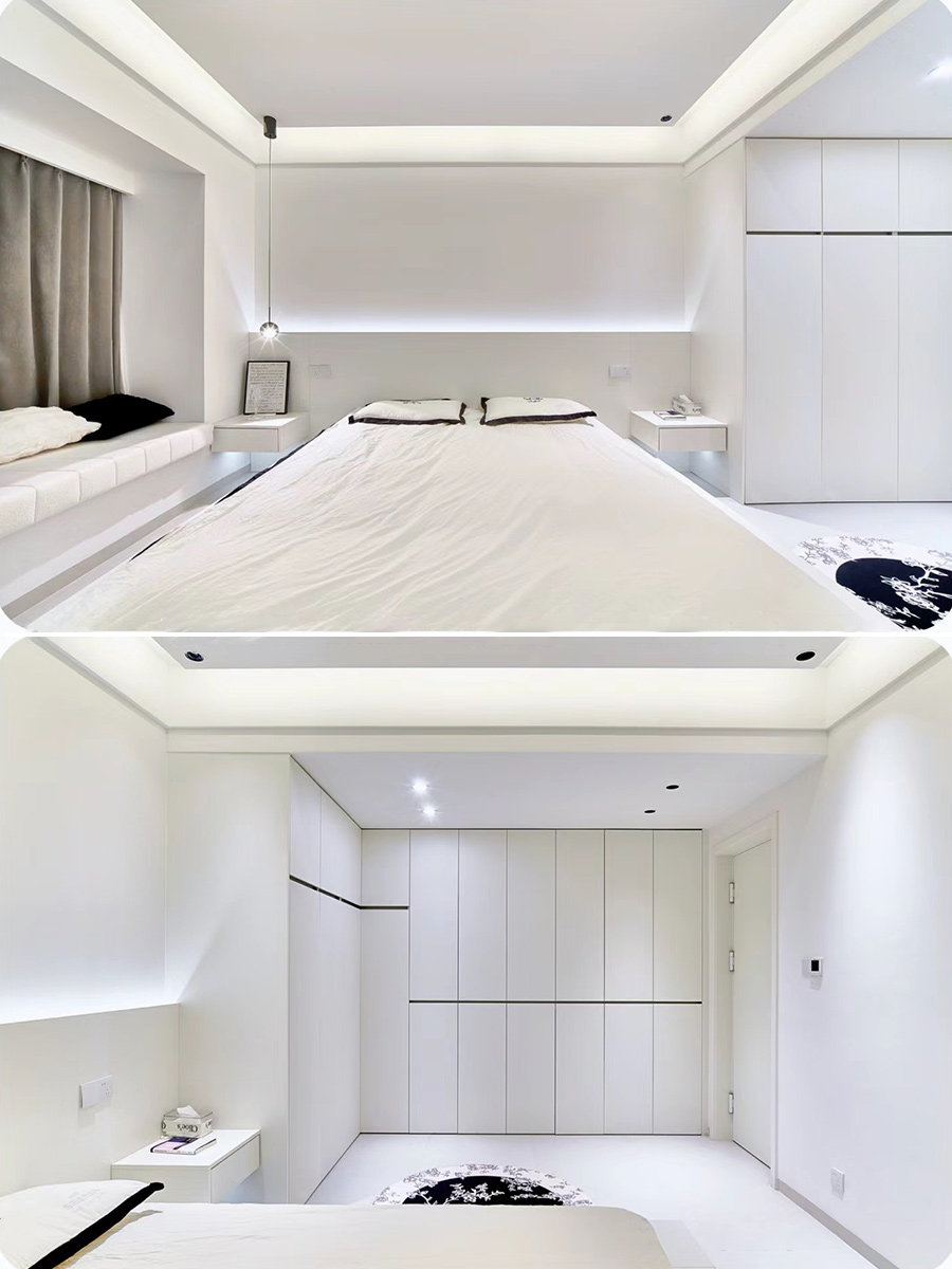 主卫改超大衣帽间,采用定制悬浮灯光地台床+床头柜,满满氛围感