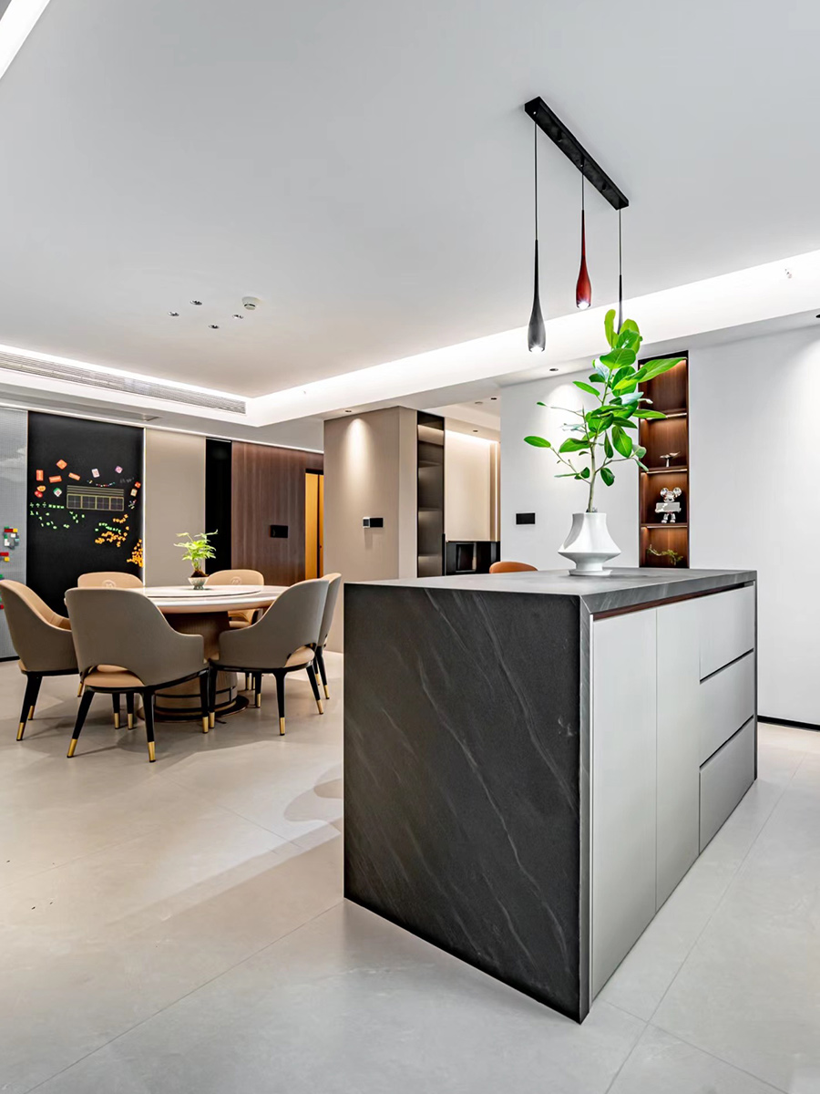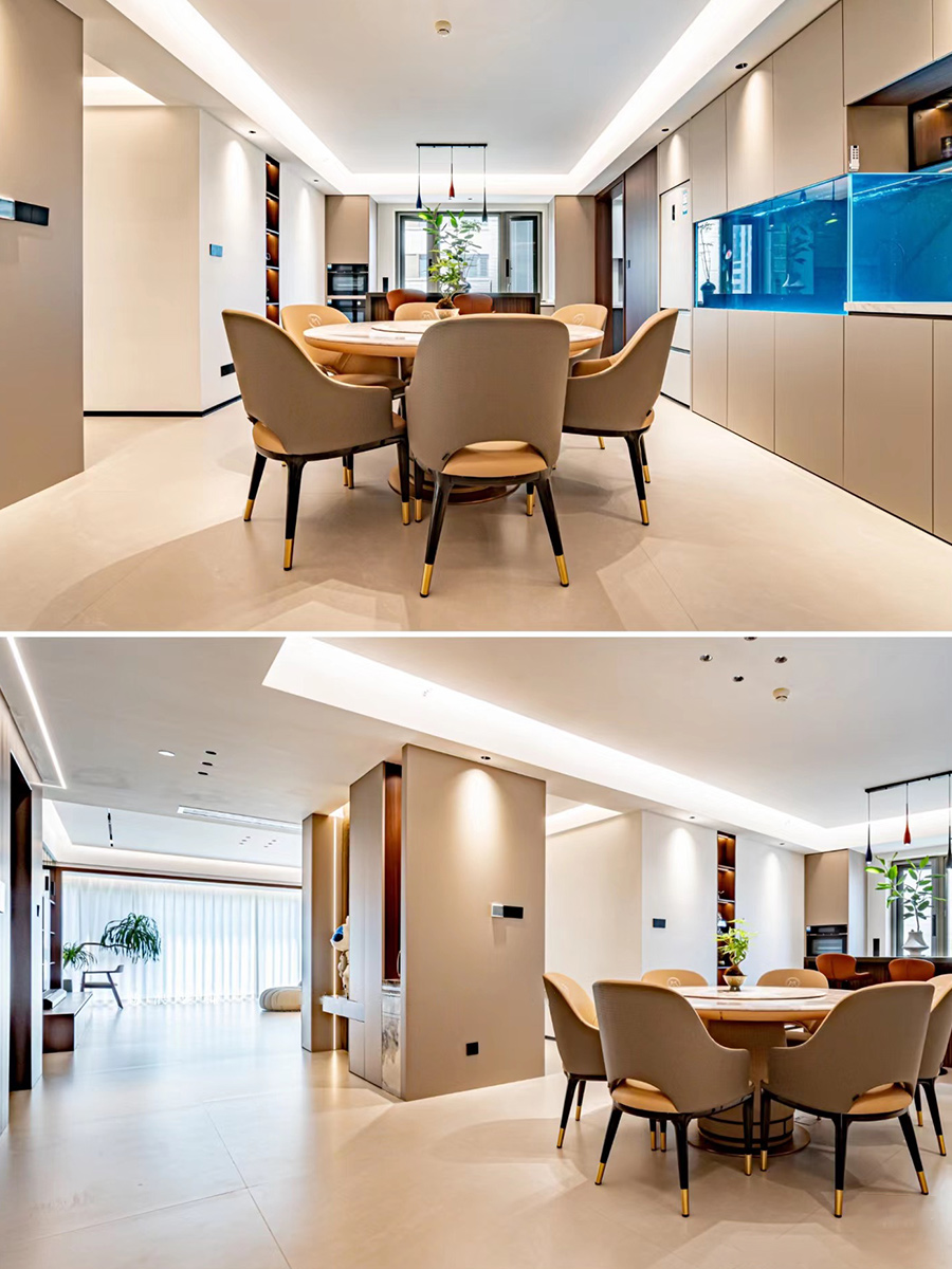 餐厅—岛台—西厨—中厨,功能分区明确,餐边柜还留出鱼缸造景区域,动线流畅。