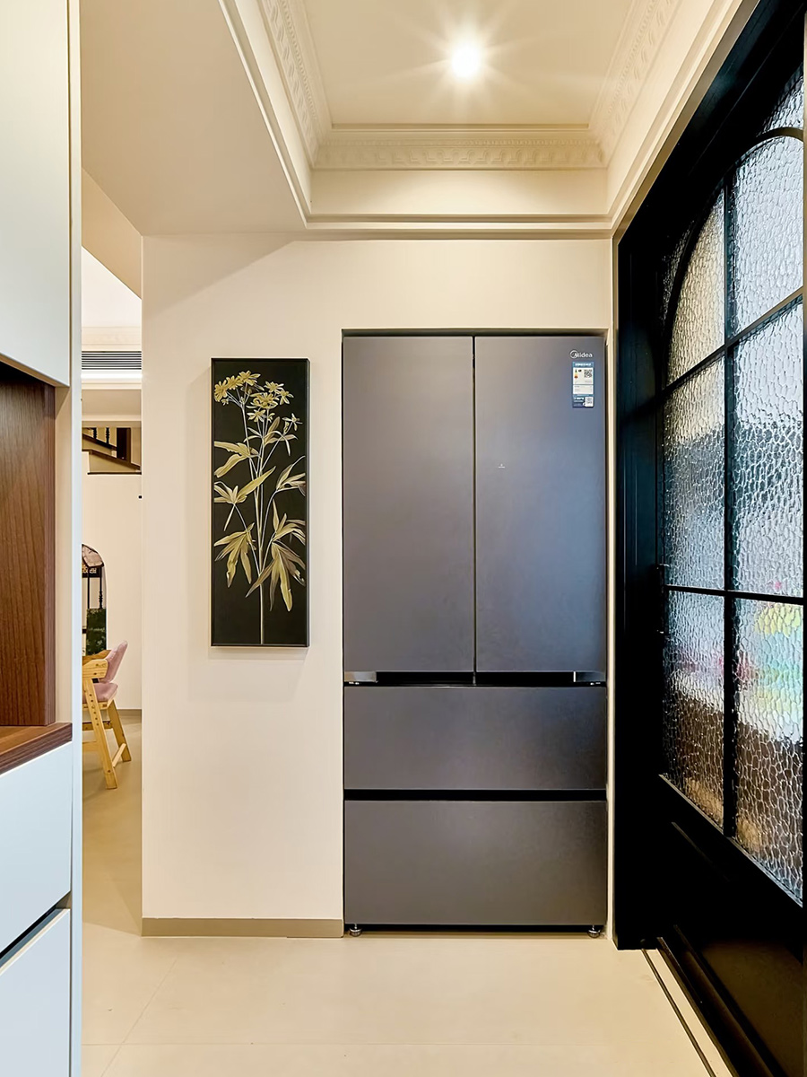 阳台大胆加入圆弧拱门和厨房黑色玻璃推拉门,更加有复古调性