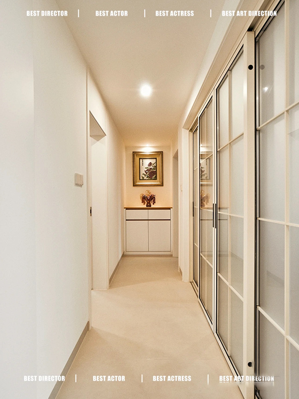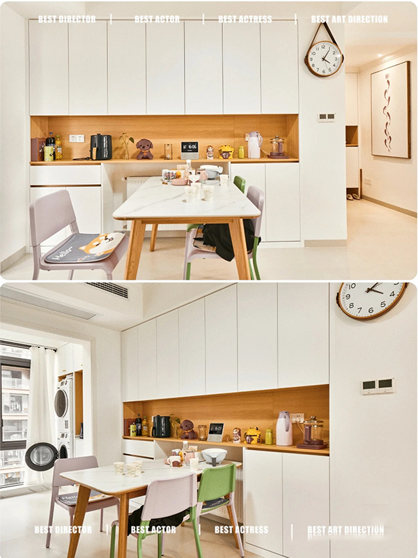 全房共定制了8个柜子,柜体采用足18厚杉木芯板,柜门采用LSB板PET肤感柜门,一门到顶,五金使用原装进口的百隆五金
