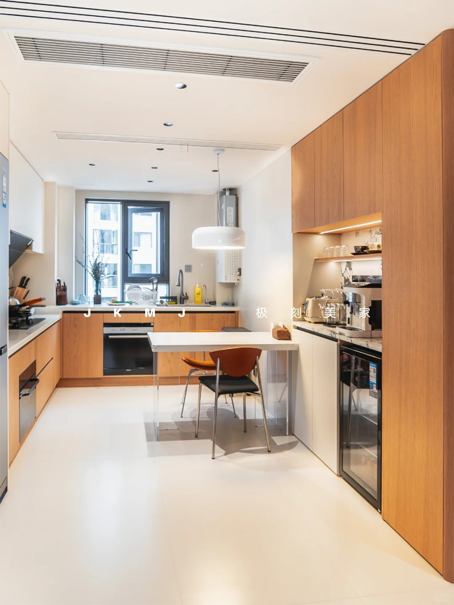 餐厅开放式的布局、岩板和亚克力的巧妙搭配、实用的原木收纳柜以及独特的吊灯设计,营造既温馨舒适又充满艺术气息的用餐空间。