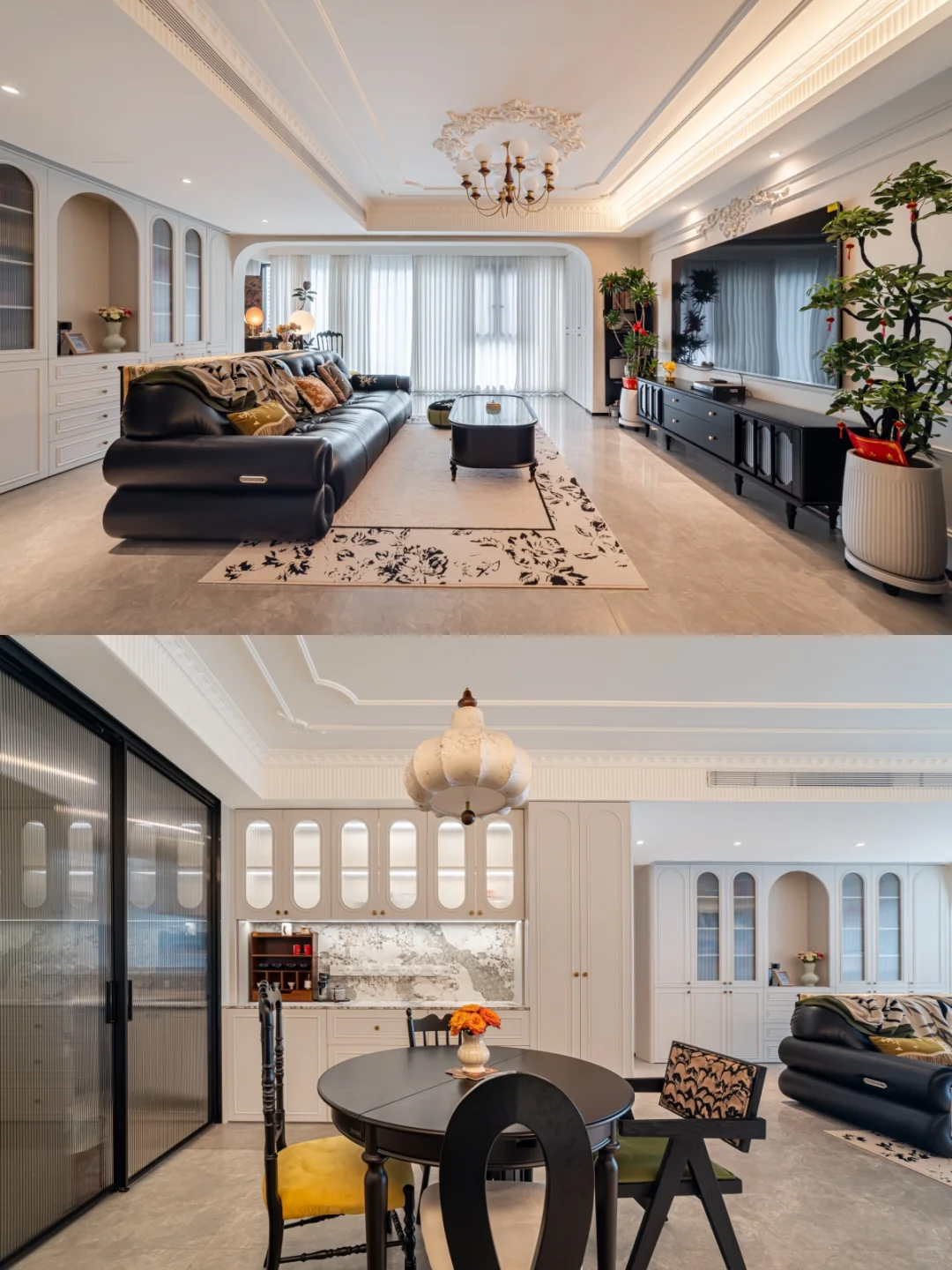 色彩材质:奶油白为主+焦糖黑点缀,石膏线条/角花增贵气