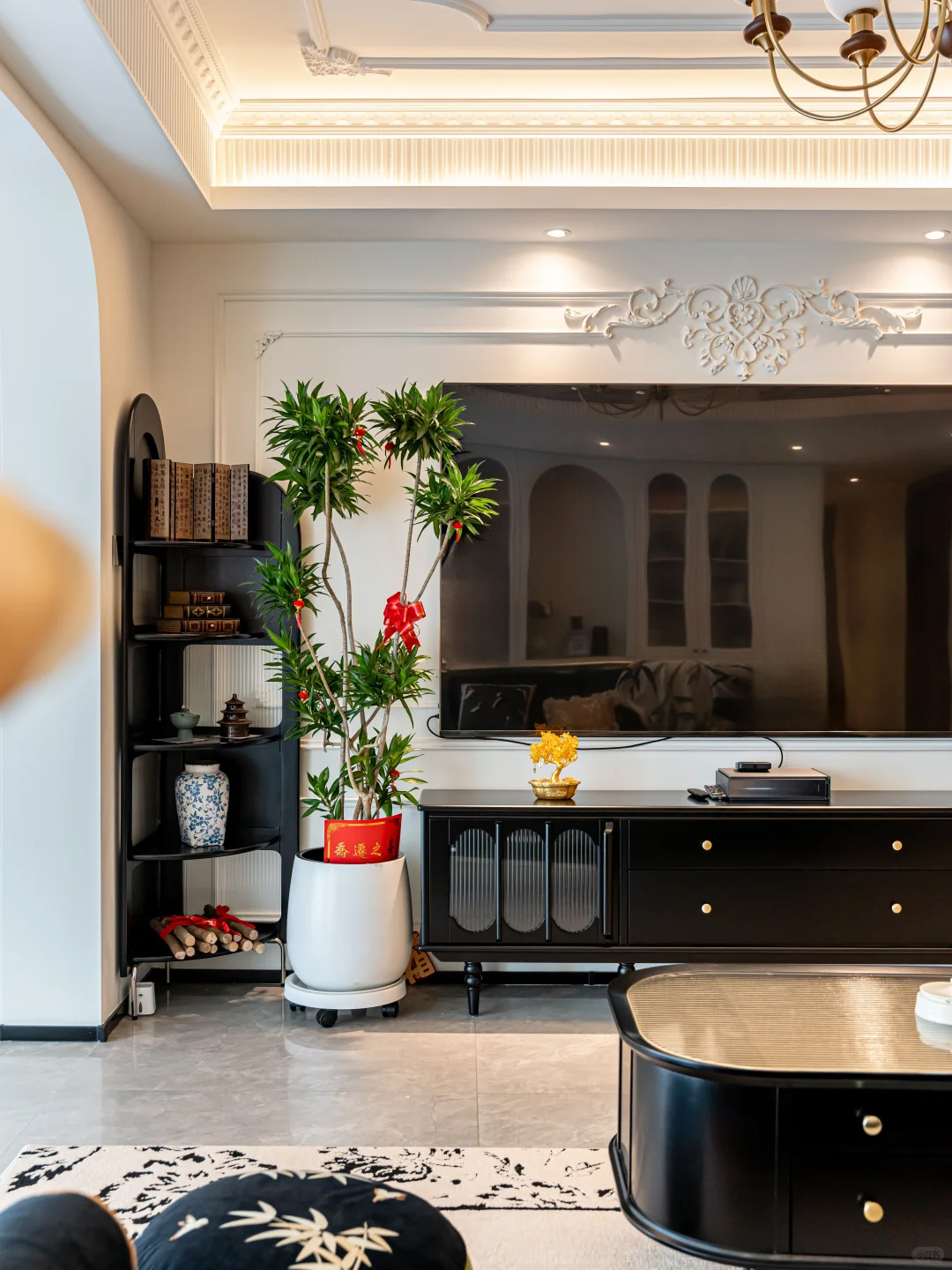 电视墙用石膏角花和PU线条勾勒,简约又高级,阳台摆上复古屏风,法式精致感瞬间到位!