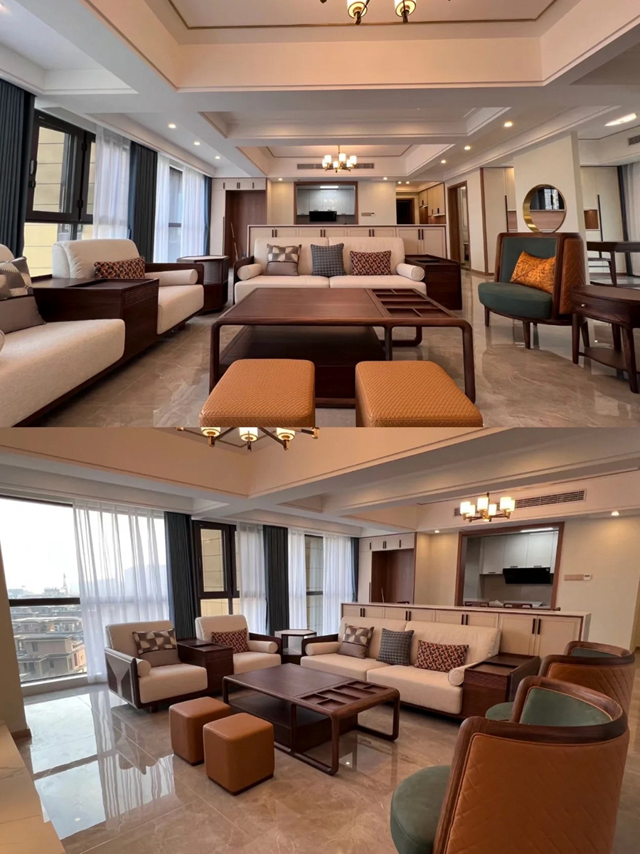 √沙发茶几等软装均选用新中式风格,让人产生古色古香的视觉观感