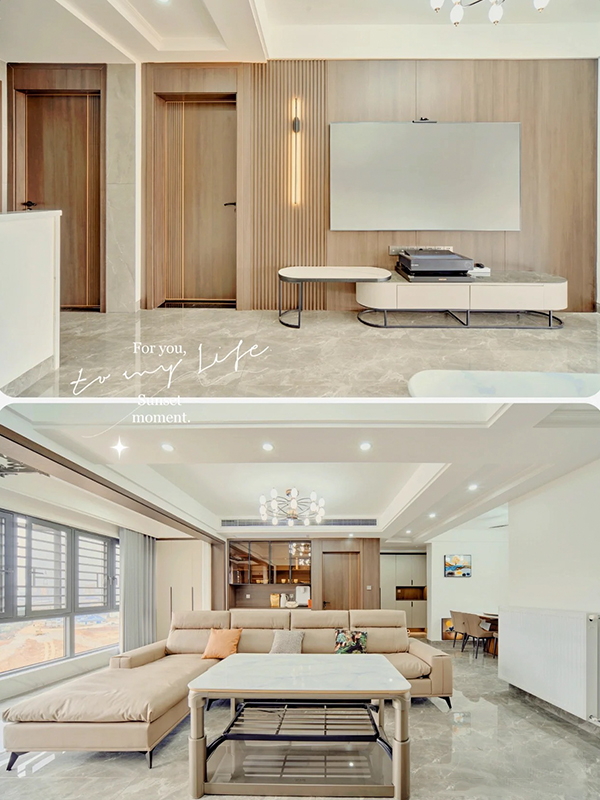 全屋多用木饰面元素,增加整体的格调,柜子全房同款同色同造型,搭配灯带等元素,瞬间拉高氛围感,柔光瓷砖通铺,明亮又显大,视觉上更加干净整洁