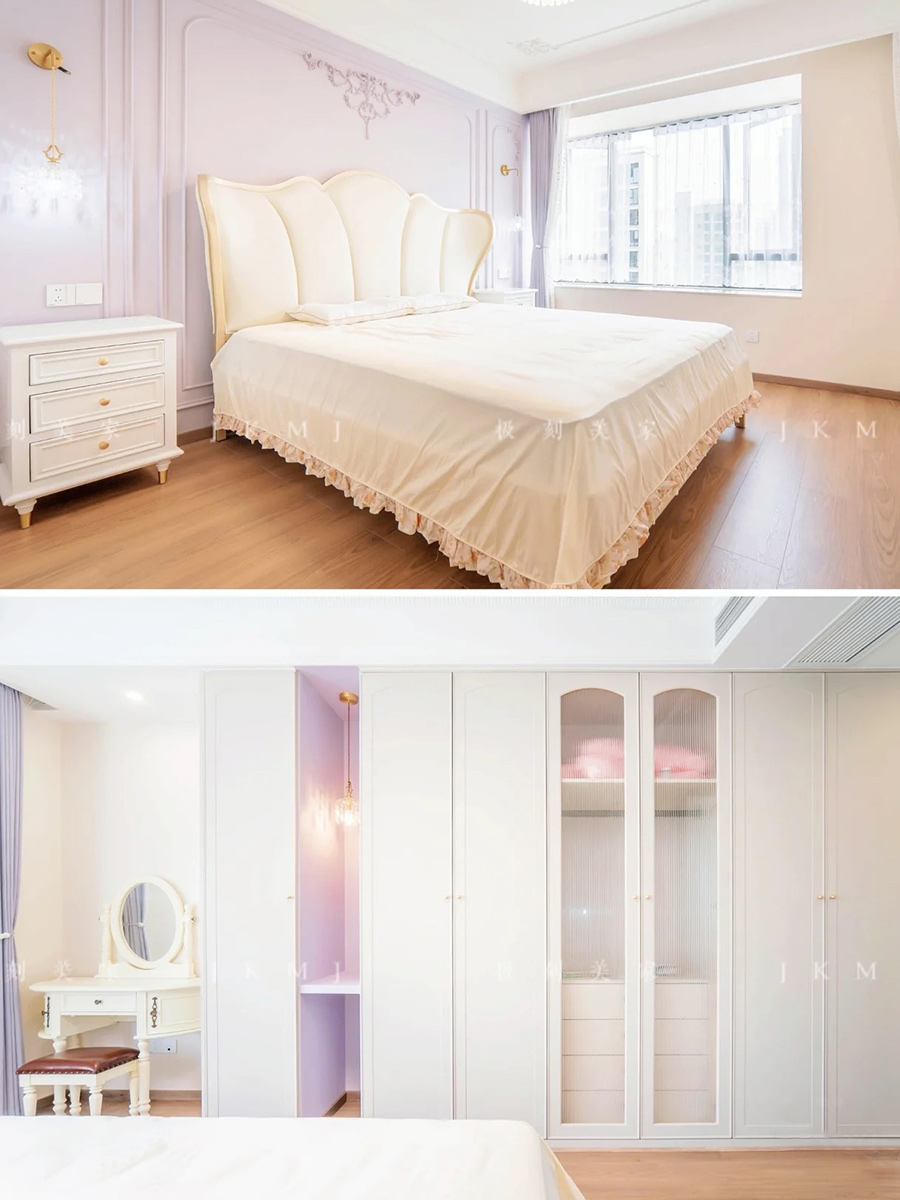 卧室用浅色系的背景墙做搭配,搭配造型柜,更显优雅