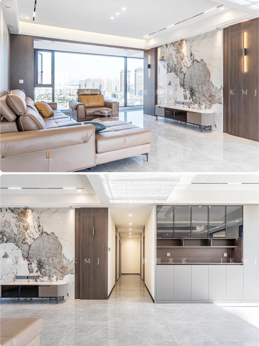 电视背景墙采用岩板装饰,与整体灰色调相碰撞,更有质感