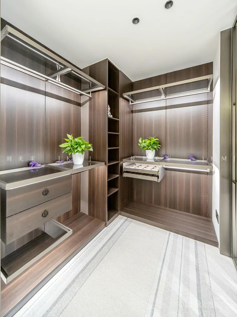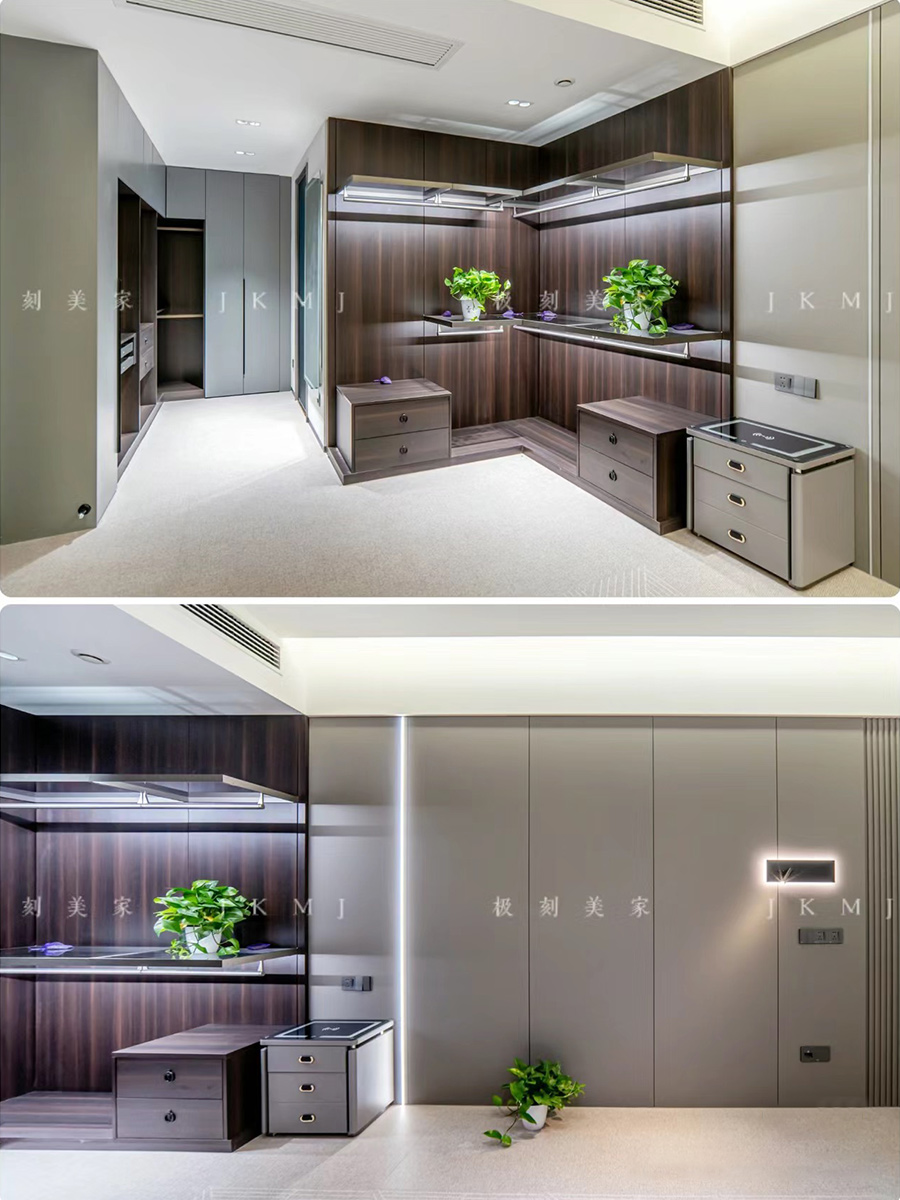 全屋高端定制:柜体板材18厚杉木实芯板,柜门有pet肤感、高光、超晶、五金使用原装进口奥地利百隆五金
