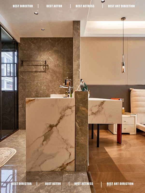 马可波罗大板砖、箭牌卫浴、圣象地板、以及与全房定制衣柜同款同色同造型的定制房门和铝合金门、恒洁洁具等