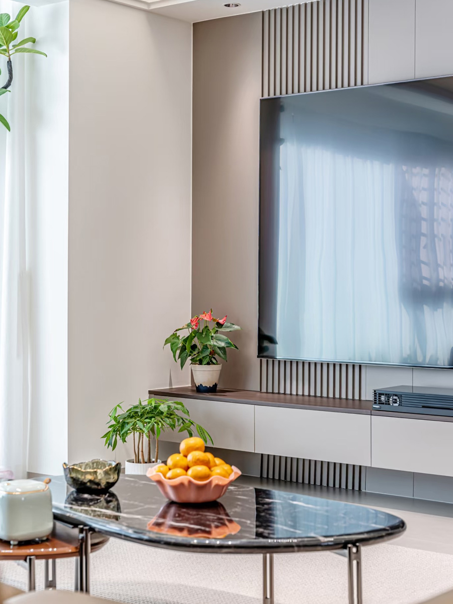 电视背景墙做简约造型,悬浮抽屉,好打理卫生