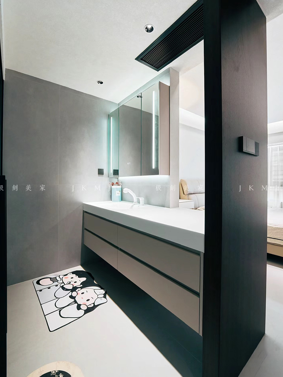 主卧做满墙衣柜,用浴室柜做隔断设计